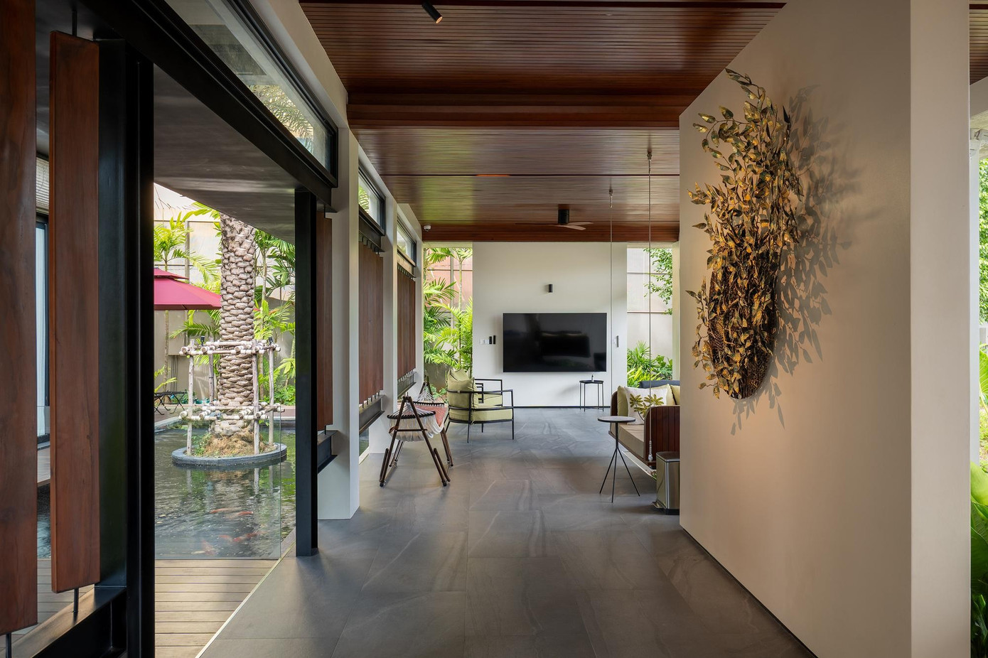 Trái tim của Wat Bo House nằm ở khu vườn và hồ cá giữa hai khối nhà. Không chỉ tạo cảnh quan, mặt nước và mảng xanh còn đóng vai trò điều hòa vi khí hậu, giúp không gian luôn mát mẻ quanh năm – yếu tố đặc biệt quan trọng trong điều kiện khí hậu nóng ẩm của Siem Reap. Từ nhiều vị trí trong nhà, tầm nhìn luôn hướng ra cây cối, mặt nước thay vì chỉ đối diện với những bức tường kín.