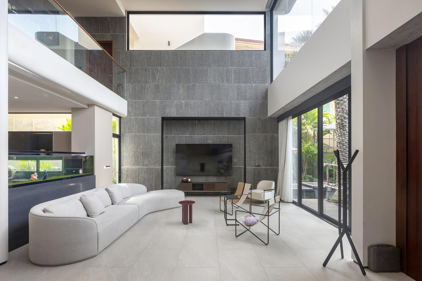 Phòng khách với trần cao và tận dụng tối đa ánh sáng tự nhiên thông qua các ô cửa kính lớn