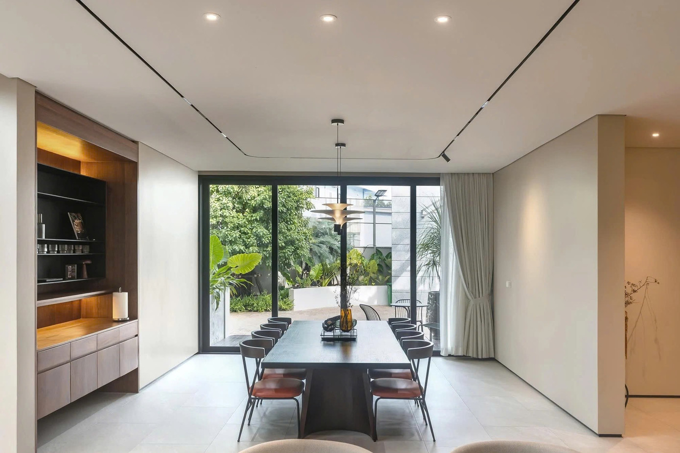 Không gian phòng ăn với bàn dài và hệ cửa kính mở ra sân vườn