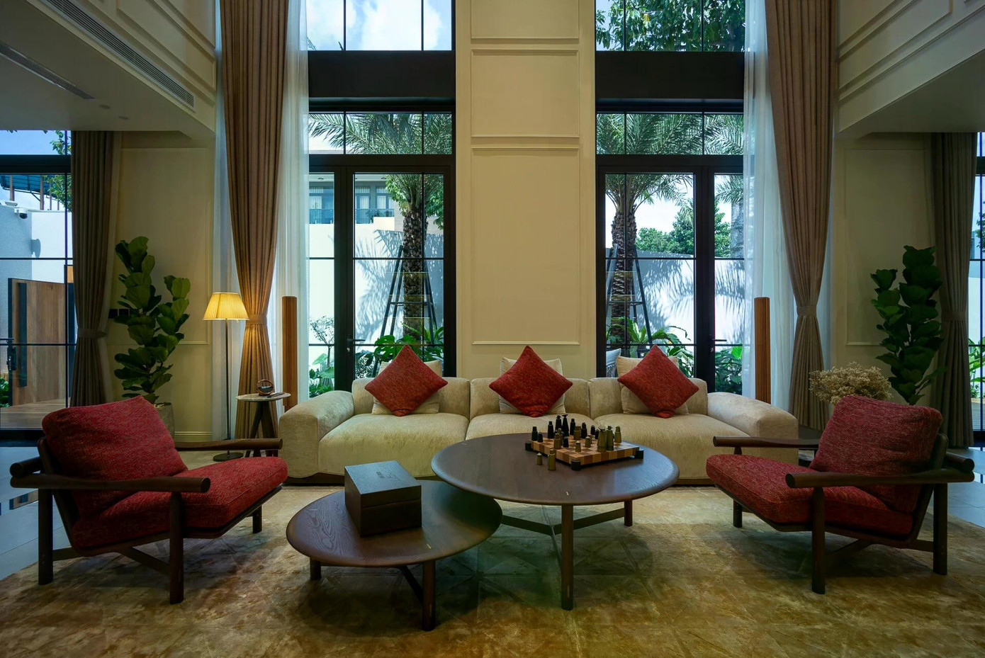 Bước vào bên trong, bảng màu be chủ đạo bao trùm toàn bộ không gian. Tông màu trung tính này được điểm xuyết bằng sắc hồng đất và ánh sáng vàng ấm, tạo nên bầu không khí nhẹ nhàng, thanh lịch.