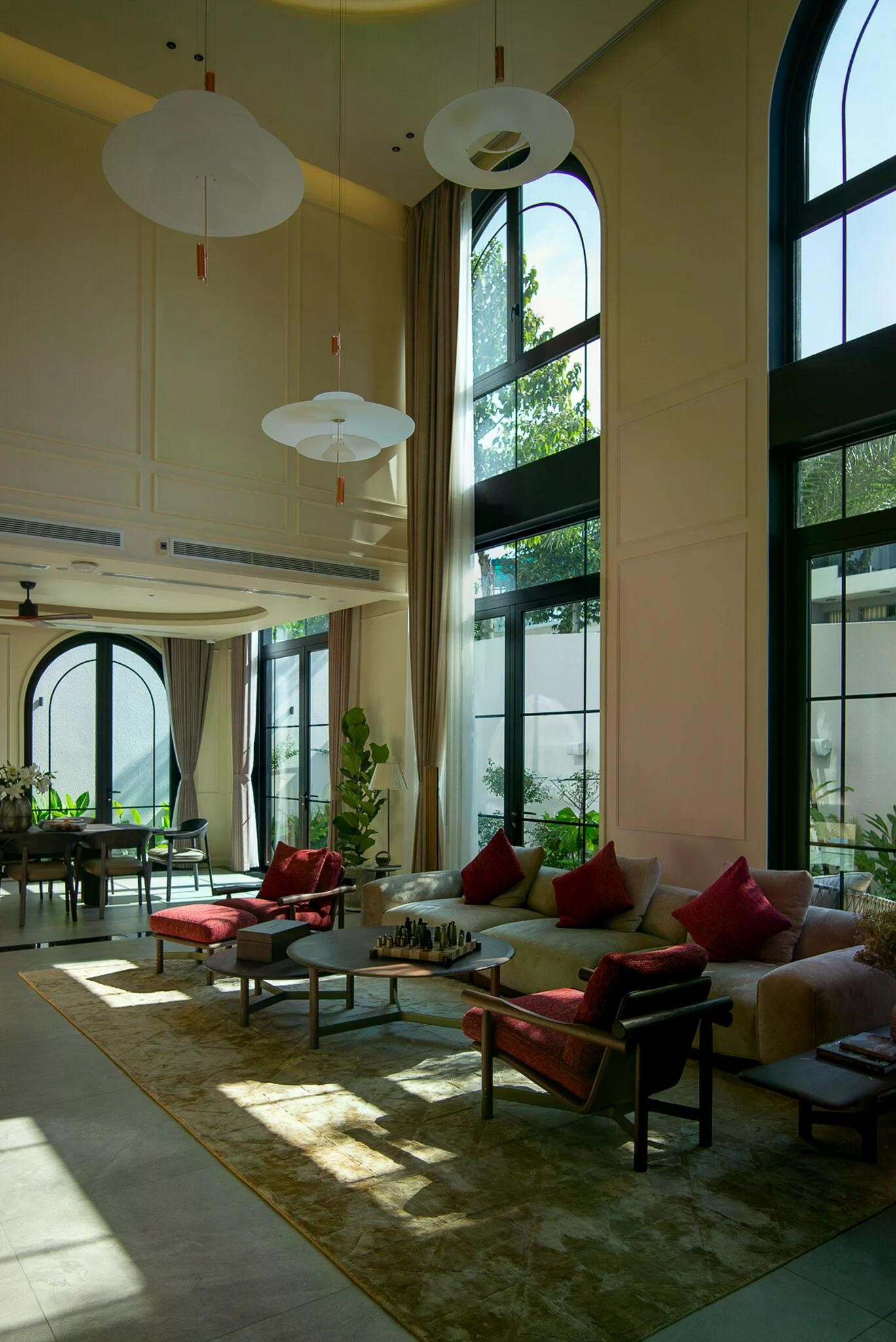 Thay vì lựa chọn một hình thức kiến trúc cầu kỳ thường thấy ở dòng biệt thự tân cổ điển, nhóm thiết kế đi theo hướng tiết giảm chi tiết, giữ lại những đường nét đặc trưng nhưng làm mới bằng tư duy hiện đại.