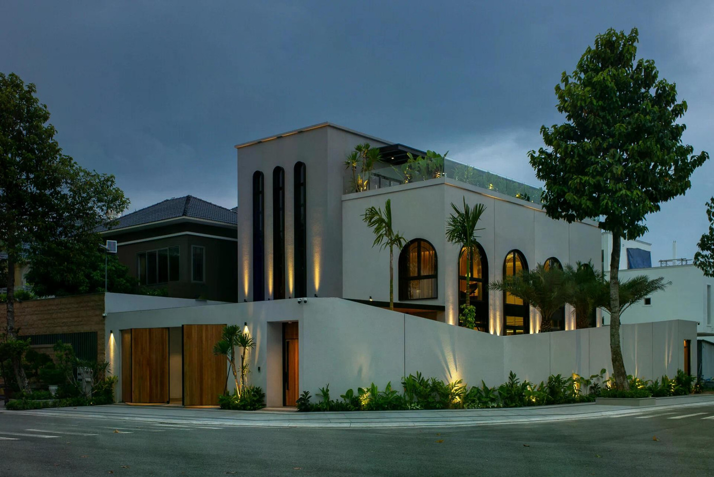Ấn tượng đầu tiên về công trình là hình khối rõ ràng, cân xứng. Mặt tiền sử dụng các mảng tường lớn, kết hợp hệ cửa vòm cao, tạo nên nhịp điệu mềm mại trên nền kiến trúc khỏe khoắn. Không quá nhiều phào chỉ hay phù điêu, ngôi nhà ghi điểm bằng tỷ lệ hài hoà và sự tinh giản có chủ đích.
