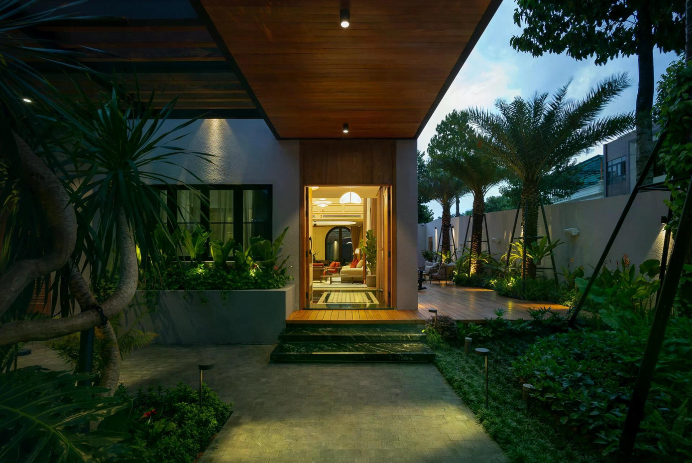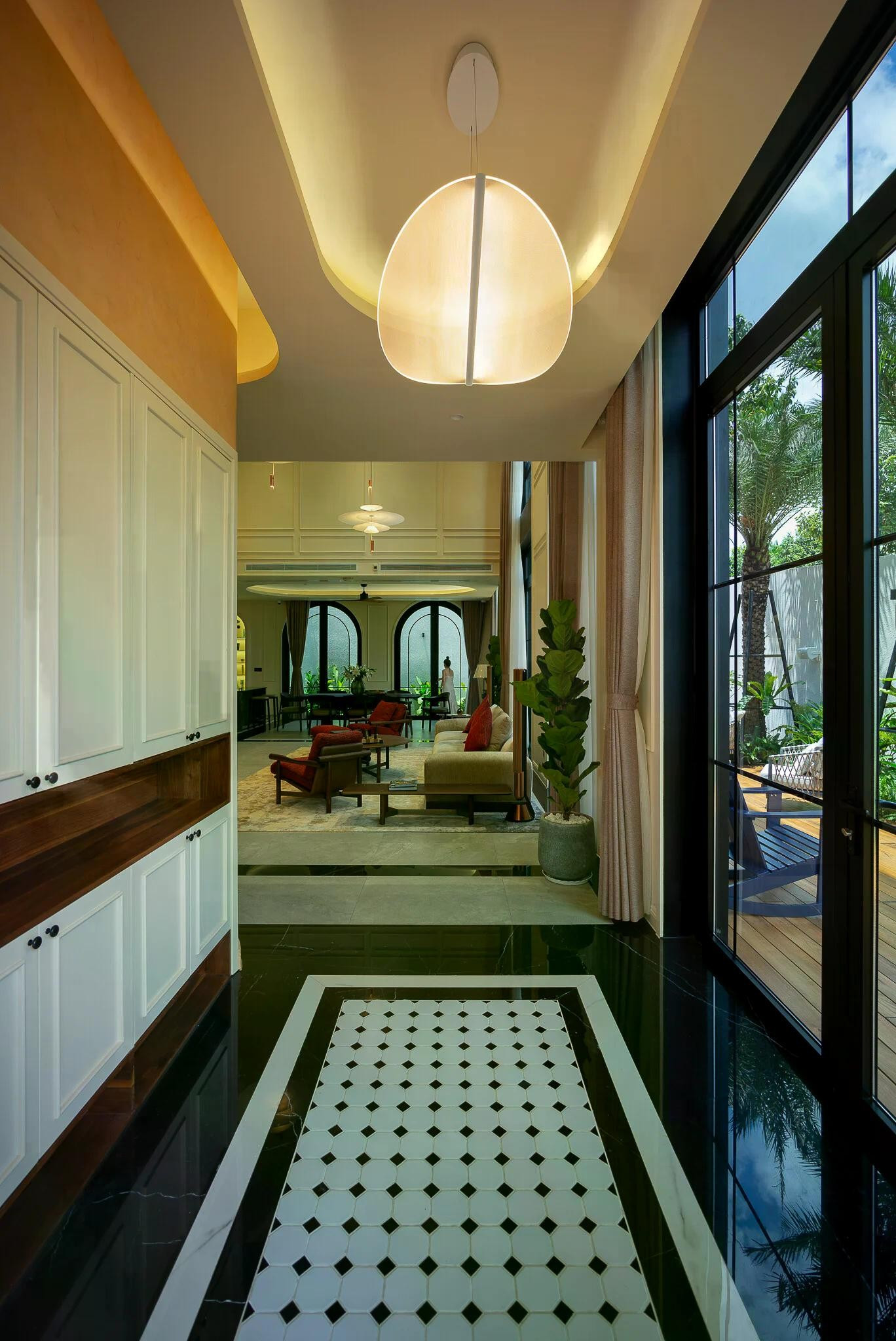 Thay vì lựa chọn một hình thức kiến trúc cầu kỳ thường thấy ở dòng biệt thự tân cổ điển, nhóm thiết kế đi theo hướng tiết giảm chi tiết, giữ lại những đường nét đặc trưng nhưng làm mới bằng tư duy hiện đại.