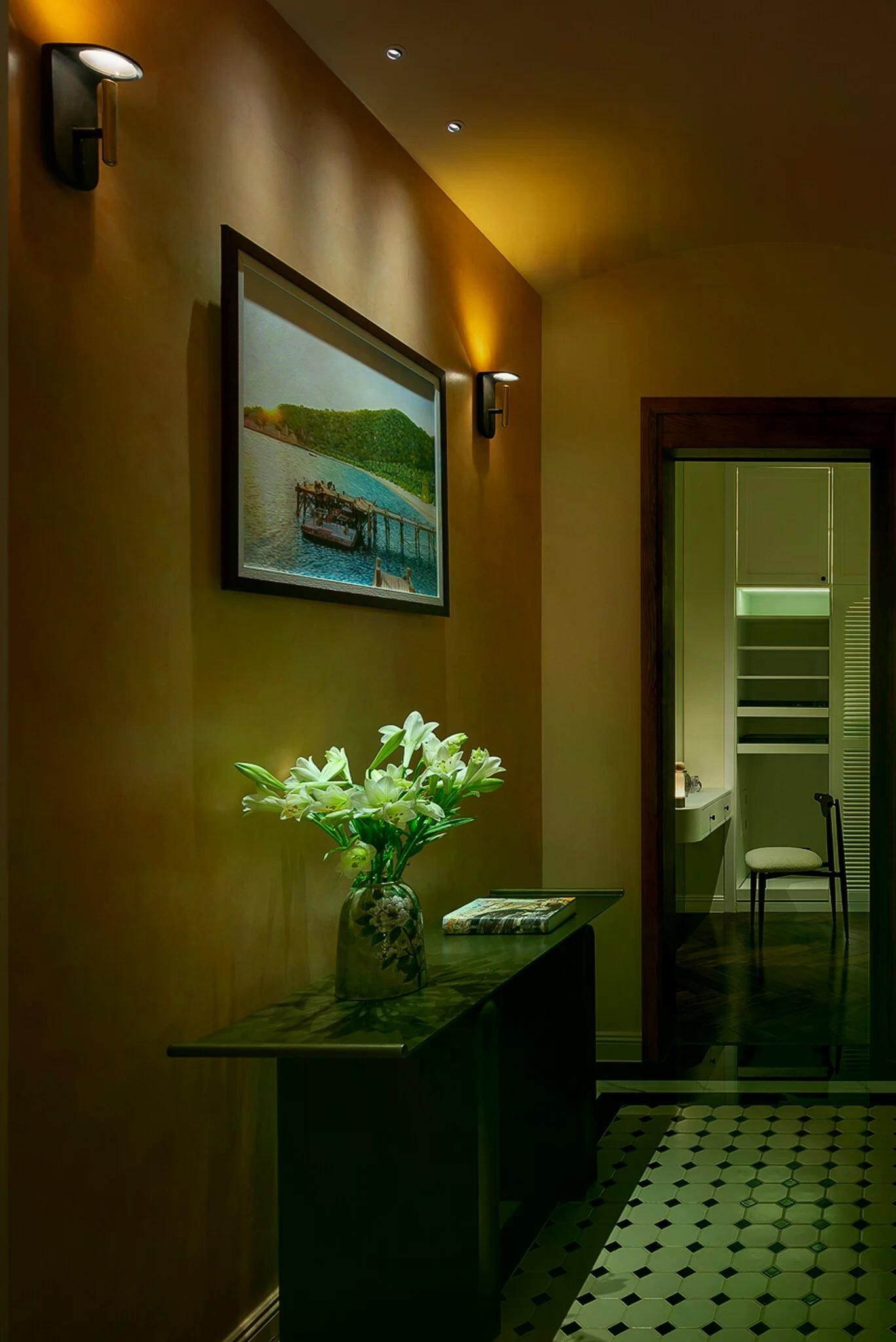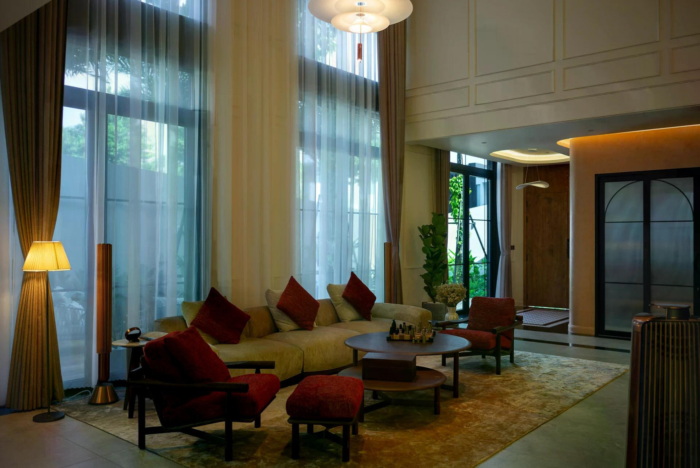Bước vào bên trong, bảng màu be chủ đạo bao trùm toàn bộ không gian. Tông màu trung tính này được điểm xuyết bằng sắc hồng đất và ánh sáng vàng ấm, tạo nên bầu không khí nhẹ nhàng, thanh lịch.