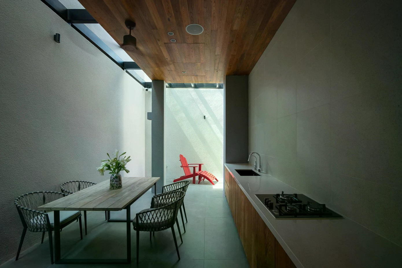 Không gian phòng khách - bếp ăn được thiết kế mở, liền mạch với sân vườn phía ngoài. Những khung cửa lớn cho phép ánh sáng tự nhiên tràn vào sâu bên trong, làm nổi bật chất liệu đá, gỗ và vải mềm. Sự kết hợp này mang cảm giác sang trọng nhưng không lạnh lẽo, hiện đại mà vẫn ấm áp.