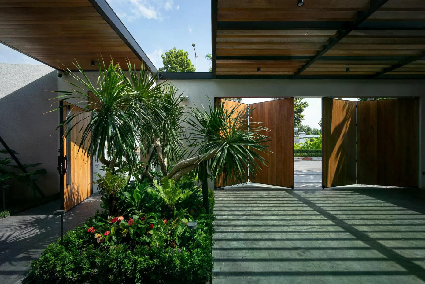 Hàng rào được xử lý vạt chéo, vừa đảm bảo tính riêng tư cho gia chủ, vừa tạo hiệu ứng thị giác khác biệt khi nhìn từ ngoài vào. Cách tổ chức này giúp công trình “đủ kín” để tách biệt với không gian xung quanh, nhưng vẫn giữ được sự thông thoáng cần thiết của một ngôi nhà ven sông.