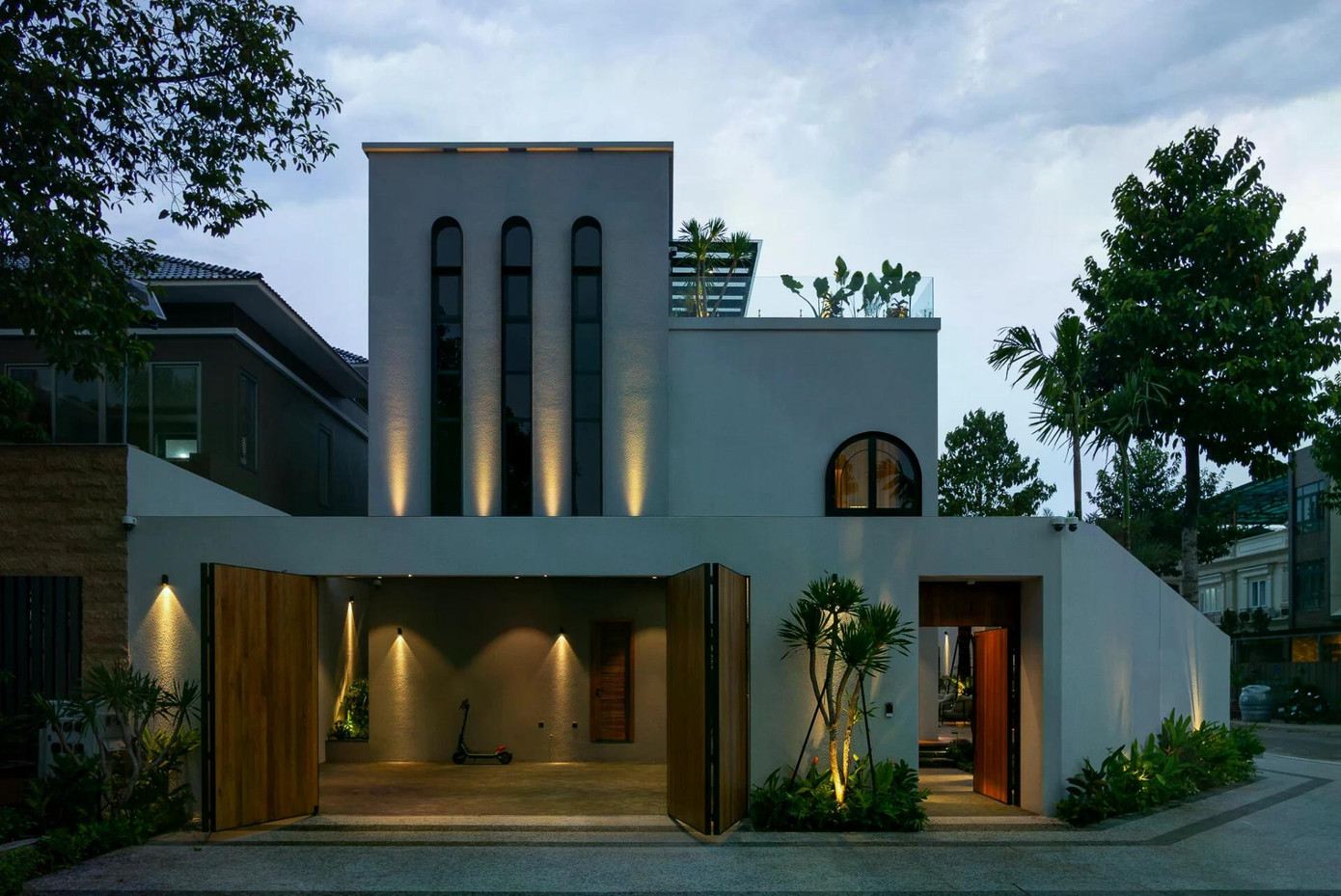 Ấn tượng đầu tiên về công trình là hình khối rõ ràng, cân xứng. Mặt tiền sử dụng các mảng tường lớn, kết hợp hệ cửa vòm cao, tạo nên nhịp điệu mềm mại trên nền kiến trúc khỏe khoắn. Không quá nhiều phào chỉ hay phù điêu, ngôi nhà ghi điểm bằng tỷ lệ hài hoà và sự tinh giản có chủ đích.