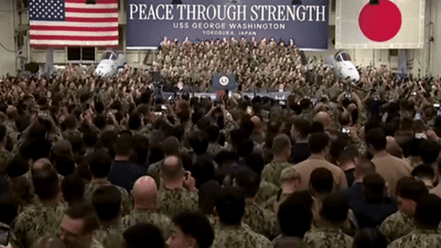 Binh lính Mỹ ở Nhật đồng loạt làm 1 điều khi Tổng thống Trump bước vào tàu sân bay USS George Washington