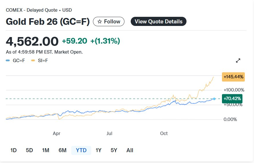 Trong phiên ngày 26/12, giá vàng tương lai vượt mốc 4.550 USD/ounce và dao động quanh mức cao kỷ lục. Tính từ đầu năm, vàng đã lập hơn 50 kỷ lục giá mới.