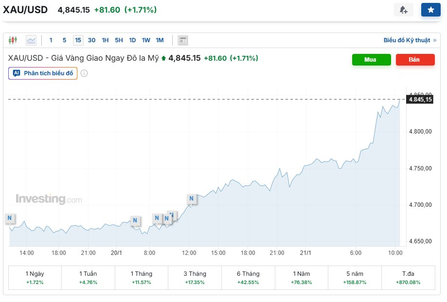 Số liệu thực tế từ thị trường đang vẽ nên một kịch bản trái ngược hoàn toàn với lý thuyết "vàng số". Tính đến tháng 1/2026, giá vàng tương lai đã thiết lập cột mốc lịch sử mới tại 4.845 USD/ounce. Kim loại quý này đã tăng khoảng 9% kể từ đầu năm trong bối cảnh các lệnh áp thuế 10% đối với hàng hóa EU từ chính quyền Mỹ gây rúng động toàn cầu.