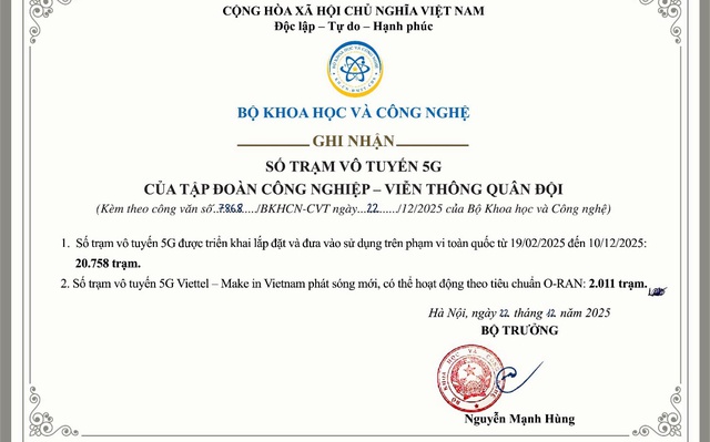 Cụ thể, trong giai đoạn từ ngày 19/2/2025 đến ngày 10/12/2025, Viettel đã triển khai 20.758 trạm 5G trên toàn quốc. Đồng thời, Tập đoàn Công nghiệp – Viễn thông Quân đội đã hoàn thành phát sóng mới 2.011 trạm 5G Viettel Make in Vietnam, đáp ứng tiêu chuẩn ORAN, phù hợp với định hướng làm chủ công nghệ chiến lược theo Nghị quyết 57-NQ/TW và Quyết định 1131/QĐ-TTg của Thủ tướng Chính phủ.