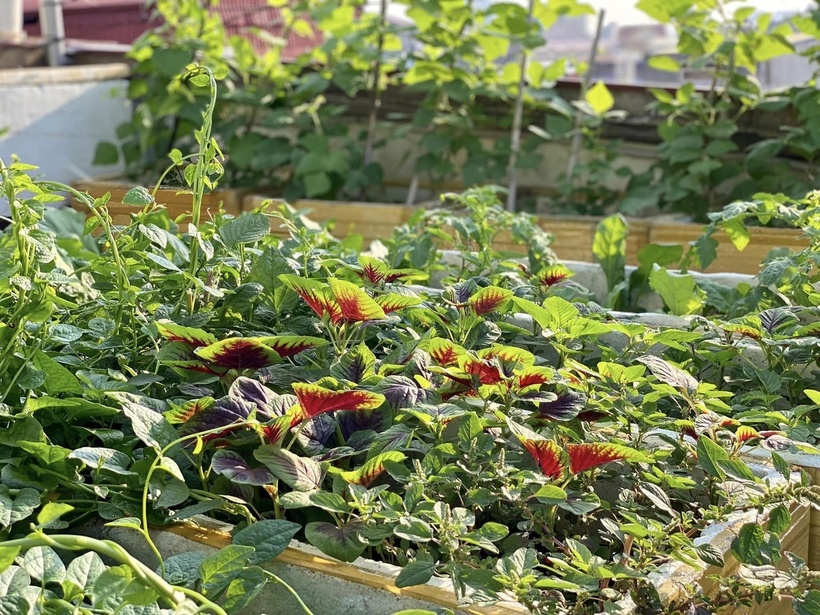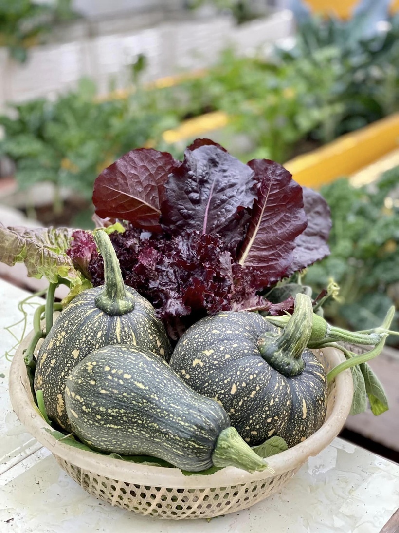 Khu vườn rộng 50m² với đủ loại rau xanh như cải kale, dền khoang không chỉ là nguồn cung cấp thực phẩm sạch mà còn trở thành điểm nhấn ấn tượng, thu hút sự chú ý của cộng đồng yêu cây trồng.