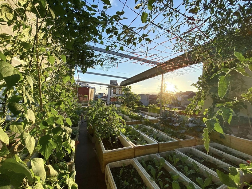 Nhận thấy sân thượng tầng cao vốn chỉ lợp tấm pro xi măng đang bị bỏ trống lãng phí, chị đã thuyết phục bố mẹ chồng cho phép cải tạo không gian này thành một vườn rau thực thụ.