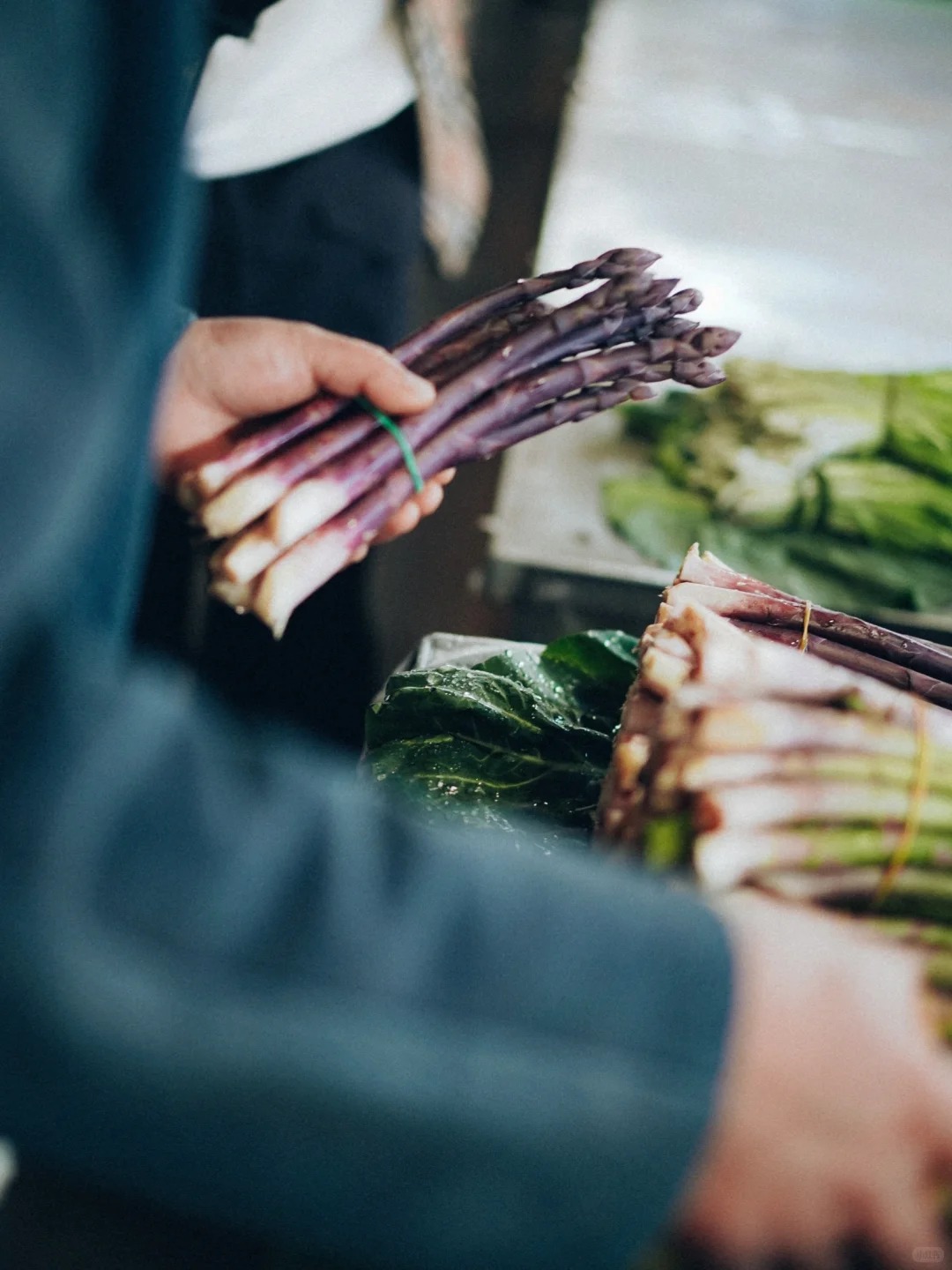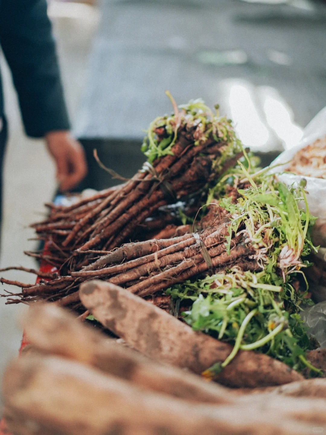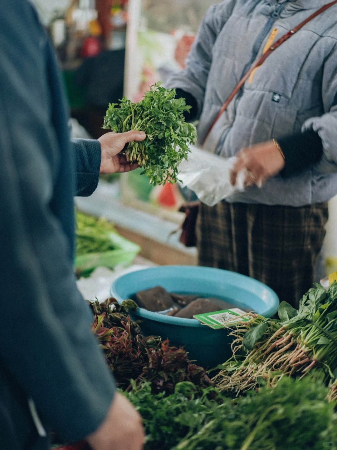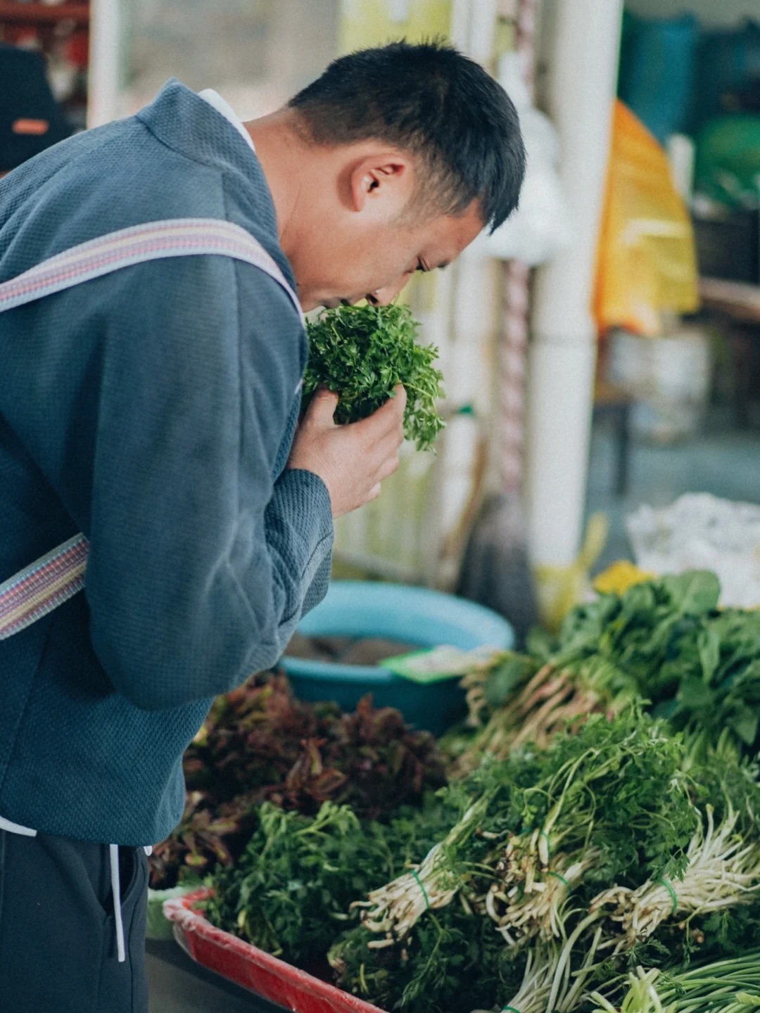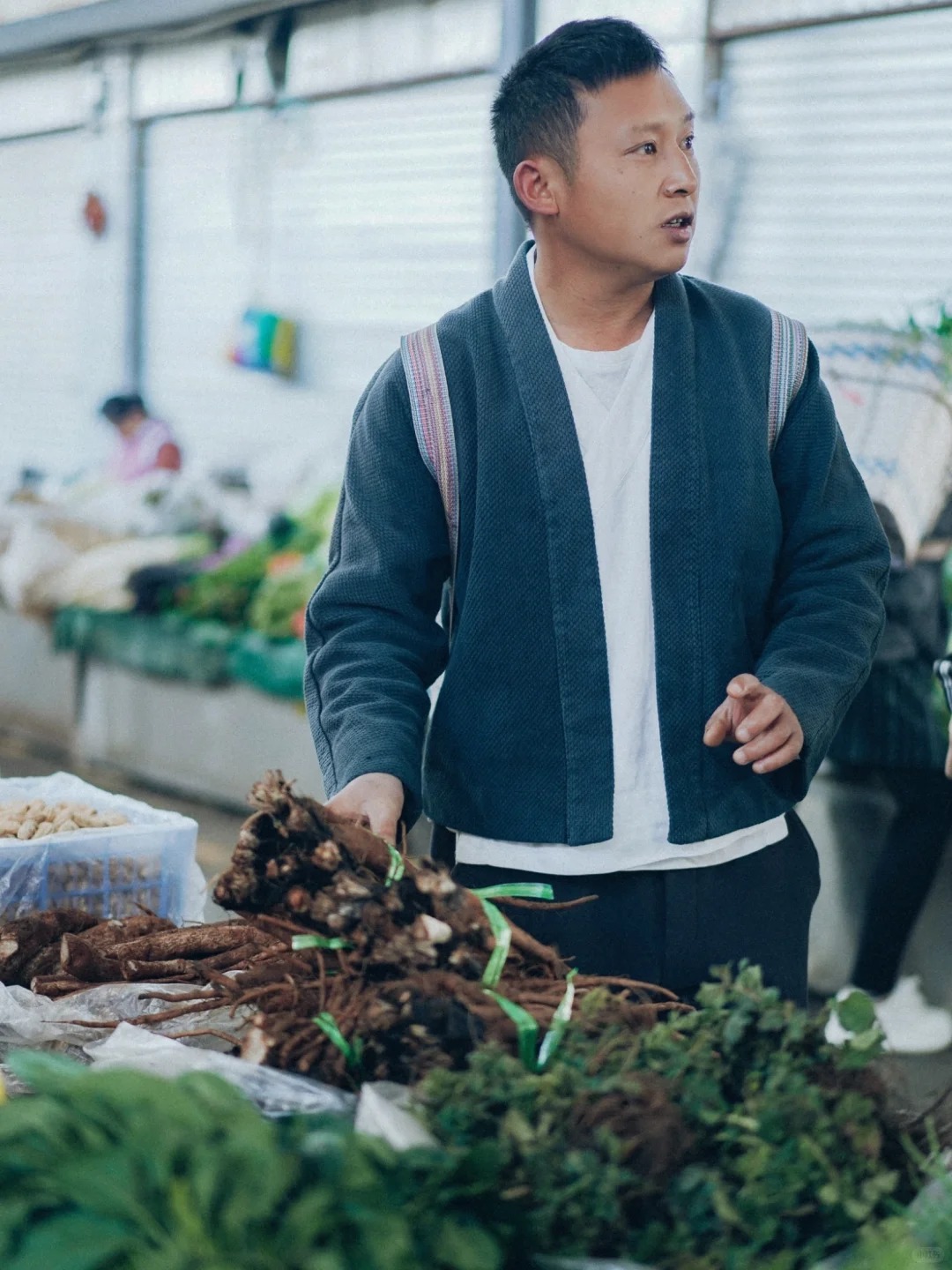 Bếp trưởng Ngô ngồi xổm xuống, nhặt một bó hương thung lên ngửi, rồi thuận tay mua thêm vài loại gia vị độc bản từ người dì quen mặt. Dì móm mém cười, nói rặc tiếng địa phương: "Cái này là rau rừng mọc tít trên vách đá mới có đấy nhé!" .