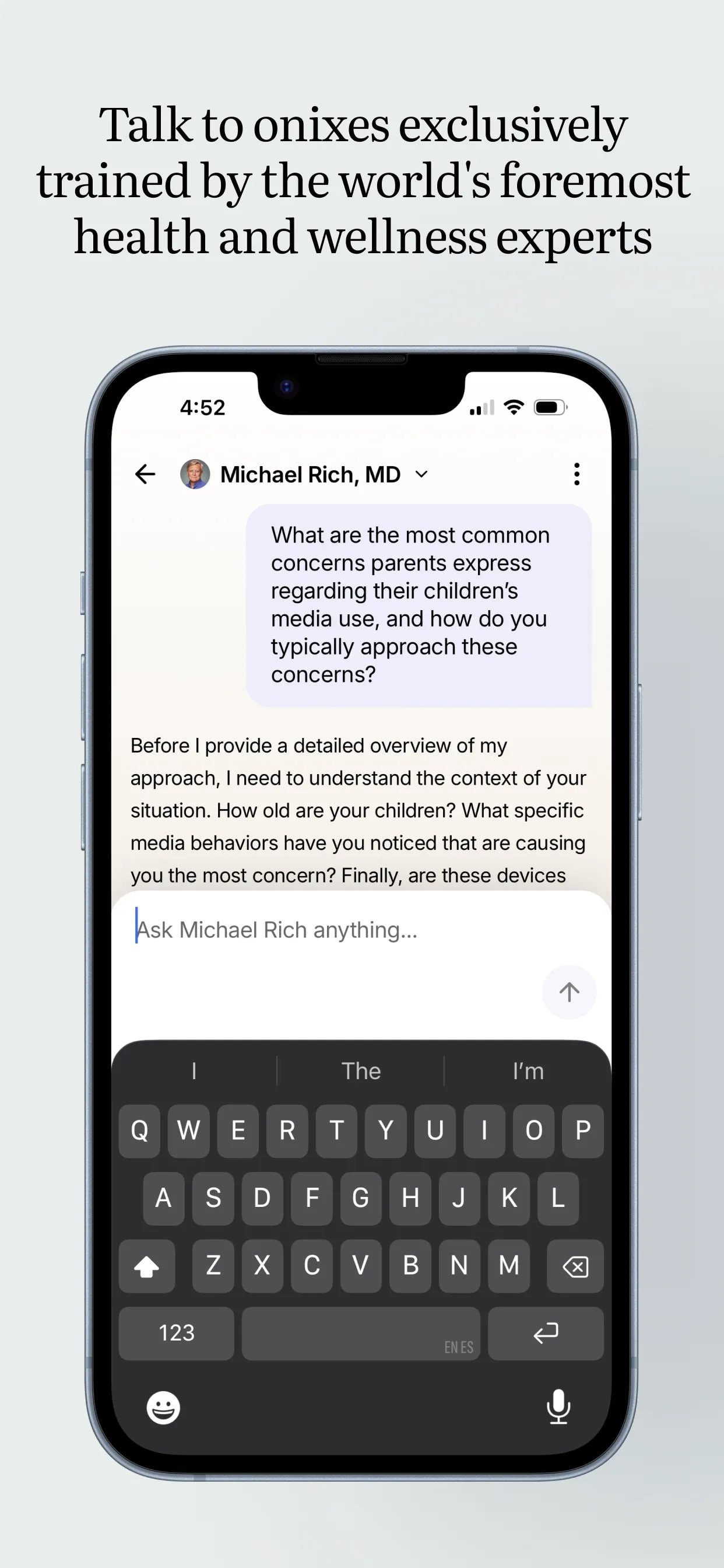 Tương tự, chuyên gia tư vấn về ảnh hưởng của truyền thông đến trẻ em Michael Rich cho biết ông tham gia vì tin tưởng vào cơ chế bảo mật và định vị rõ ràng của nền tảng. Nó có thể cung cấp hướng dẫn, không thay thế điều trị y tế.