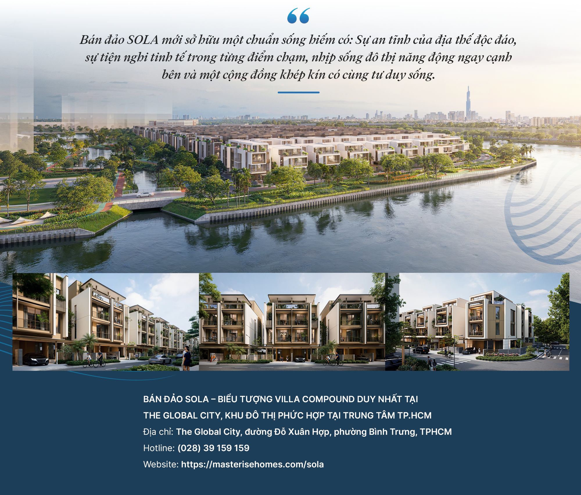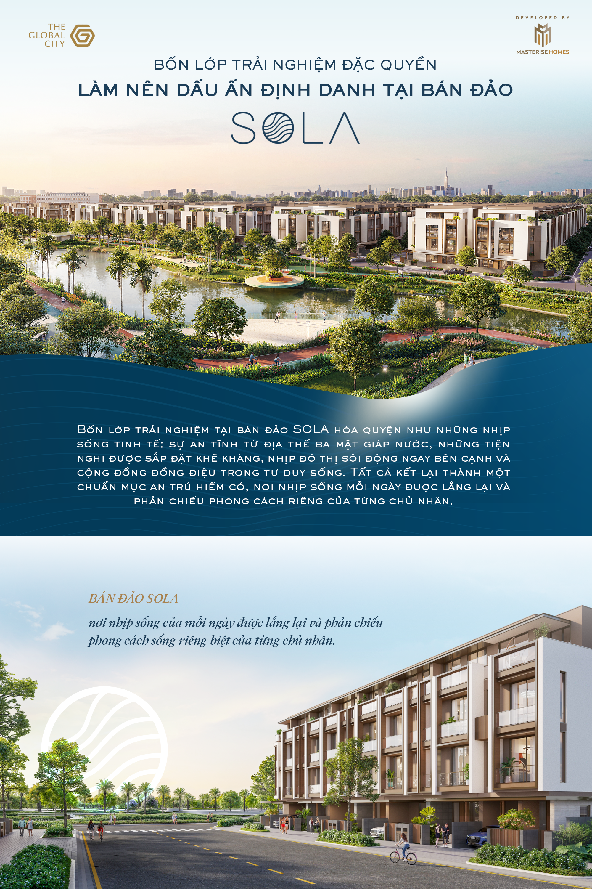 Giữa những tiện nghi ấy, kiến trúc của bán đảo SOLA mở ra với vẻ đẹp đương đại nhưng không phô trương. Những tuyến phố được tạo nhịp theo tư duy thiết kế quốc tế, façade kính đón ánh sáng từ ba mặt giáp nước, và các khoảng đệm xanh được đặt để như những "khoảng thở" tự nhiên của từng ngôi nhà. Tỉ lệ vàng trong mặt đứng và cấu trúc mở của các biệt thự đều hướng đến sự thanh lịch, đủ để cảm nhận đẳng cấp nhưng vẫn giữ trọn sự riêng tư của chủ nhân bán đảo.