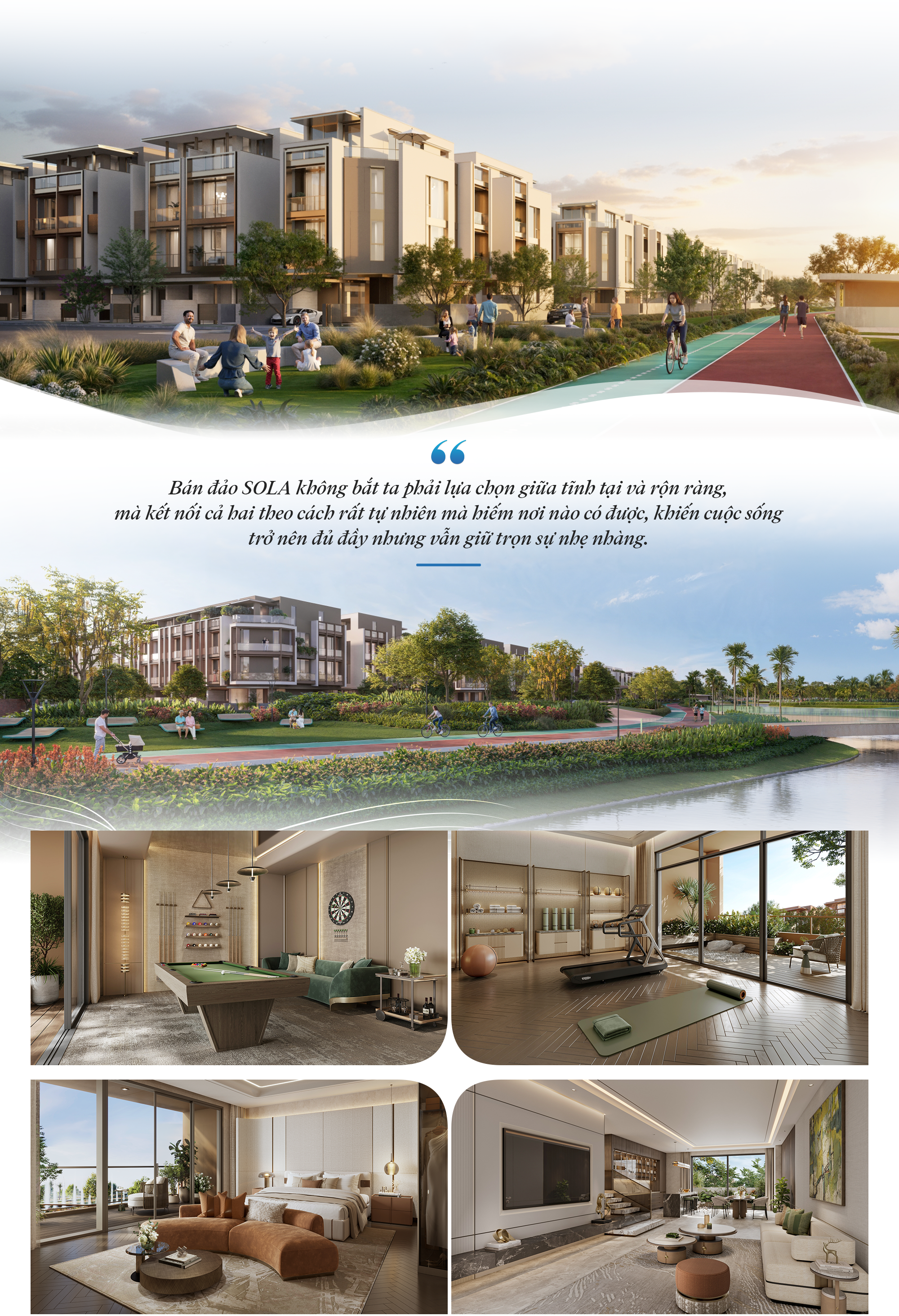 Dẫu sôi động là thế, mọi tiện ích vẫn song hành trọn vẹn với sự yên bình bên trong bán đảo. SOLA không bắt người ta phải lựa chọn giữa tĩnh tại và rộn ràng, mà kết nối cả hai theo cách rất tự nhiên mà hiếm nơi nào có được, khiến cuộc sống trở nên đủ đầy nhưng vẫn giữ trọn sự nhẹ nhàng. Kết nối giữa con người trong không gian ấy cũng nhẹ nhàng như chính nhịp sống của SOLA.