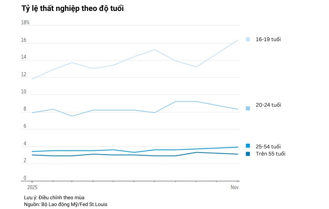 Tỷ lệ thất nghiệp của thanh thiếu niên từ 16 - 19 tuổi đã tăng gần 5 điểm phần trăm kể từ đầu năm. Tỷ lệ thất nghiệp của nhóm từ 20 - 24 tuổi, bao gồm nhiều sinh viên mới tốt nghiệp đại học, cũng tăng lên trong năm nay, dù đã hạ nhẹ trong tháng 11.