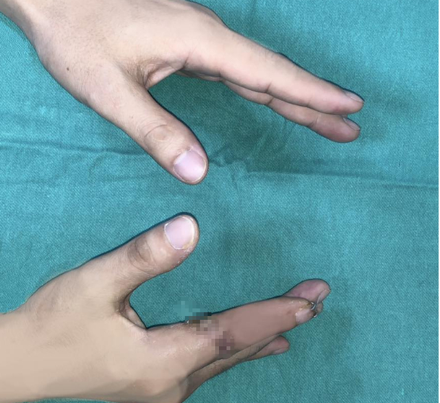 Sau phẫu thuật, vết thương đã liền, ngón tay hồng, sống hoàn toàn, người bệnh đã có thể cắt chỉ và rút kim cố định. Người bệnh đang được tập phục hồi chức năng để lấy lại khả năng vận động và cảm giác của ngón tay.