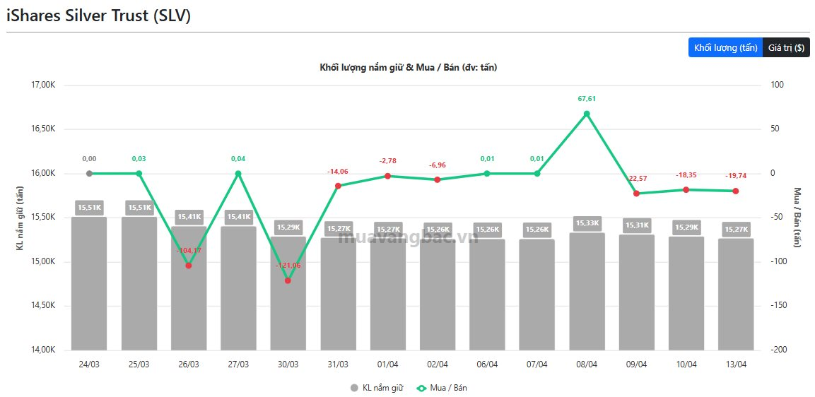 Cùng chiều giao dịch, quỹ bạc lớn nhất thế giới bán ròng gần 20 tấn bạc trong ngày 13/4.