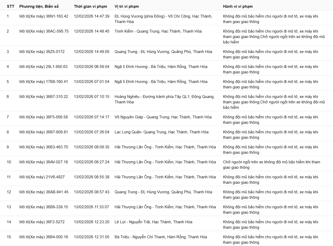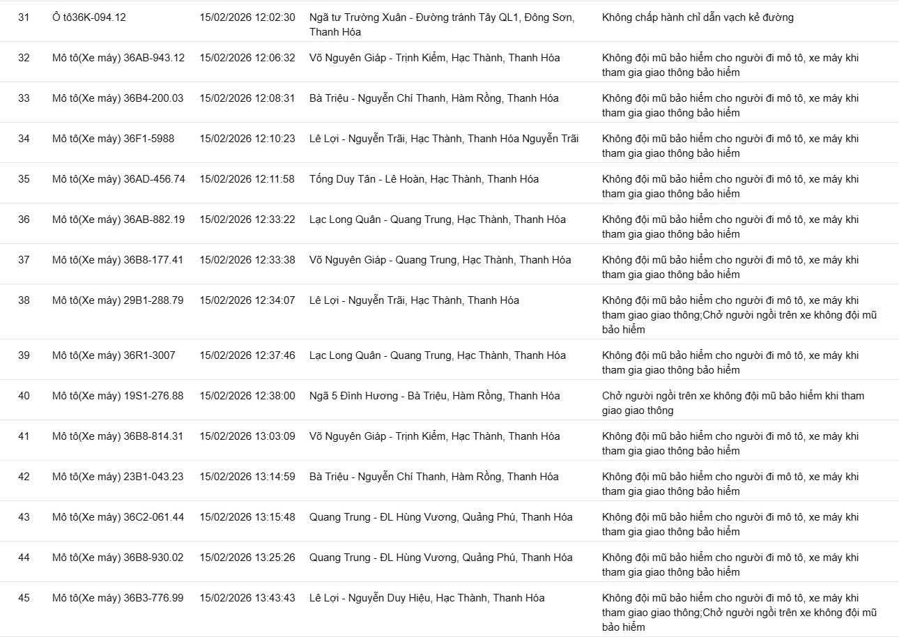 Phòng CSGT tỉnh Thanh Hóa đã xác định thêm nhiều trường hợp vi phạm bị phạt nguội từ ngày 12/2/2026 đến ngày 15/2/2026.