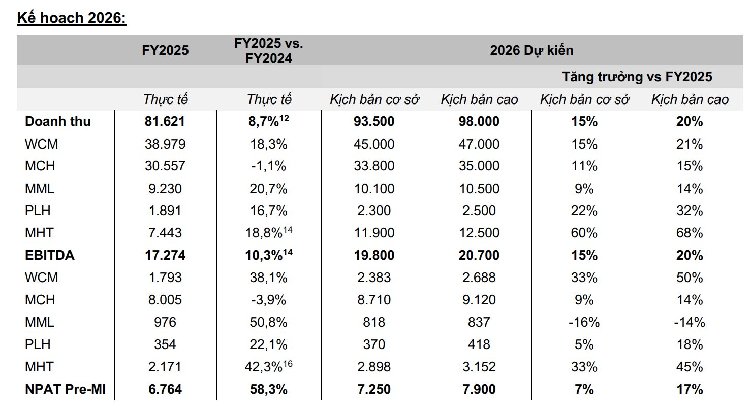 Các động lực chính bao gồm việc mở rộng Retail Supreme sang kênh On-premise (nhà hàng, quán ăn), kế hoạch mở mới 1.000 - 1.500 cửa hàng WinMart+ và mục tiêu nâng tỷ trọng thịt chế biến lên trên 50% doanh thu dài hạn của MML.