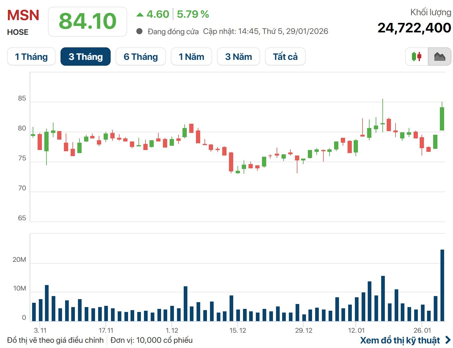Kết thúc phiên giao dịch ngày 29/01, cổ phiếu MSN của Tập đoàn Masan đóng cửa tại mức 84.100 đồng, tăng gần 6% với khối lượng giao dịch đột biến.
