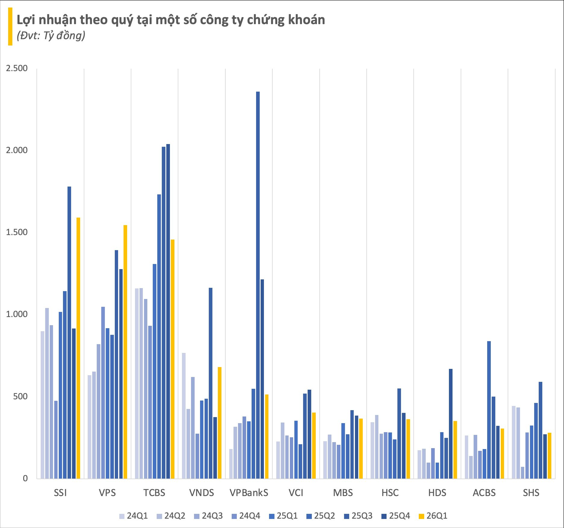 Tuy nhiên, so với quý 4/2025, con số này giảm khoảng 19%, đánh dấu quý thứ hai liên tiếp lợi nhuận toàn ngành đi xuống theo quý. Nếu tính từ mức đỉnh kỷ lục 19.000 tỷ đồng thiết lập vào quý 3/2025, bức tranh lợi nhuận đang phản ánh rất rõ sự hạ nhiệt của thị trường chung sau giai đoạn thăng hoa.