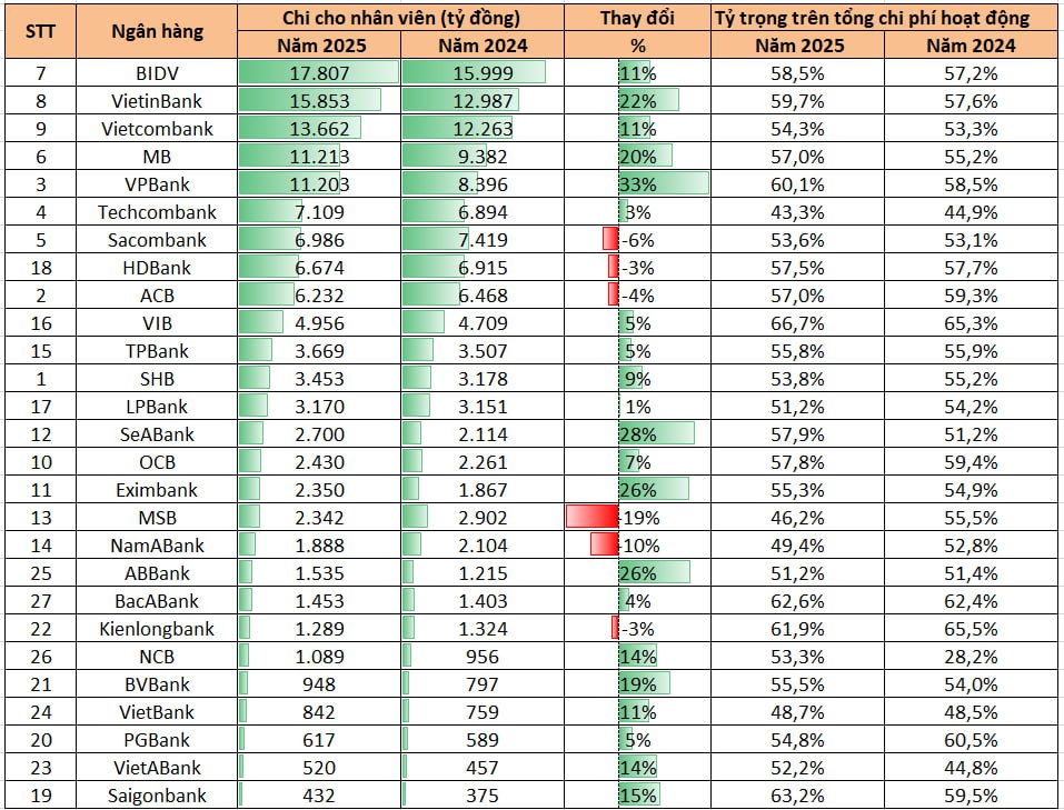 Nhìn tổng thể, năm 2025 cho thấy xu hướng gia tăng chi phí nhân sự tại nhiều ngân hàng, đặc biệt là nhóm ngân hàng lớn và ngân hàng đang mở rộng mạnh hoạt động bán lẻ và ngân hàng số. Trong bối cảnh cạnh tranh ngày càng gay gắt, đầu tư cho con người tiếp tục được xem là yếu tố then chốt giúp các ngân hàng nâng cao năng lực cạnh tranh và duy trì tăng trưởng trong những năm tới.