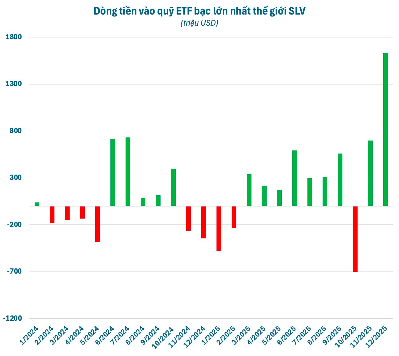 Quỹ bạc lớn nhất thế giới iShare Silver Trust (SLV) do “gã khổng lồ” BlackRock quản lý, đã chi gần 3,4 tỷ USD để mua bạc trong năm 2025. Cùng đà tăng giá bạc, quy mô tài sản quản lý của SLV lên đến hơn 40 tỷ USD, cao nhất từ trước đến nay. Quỹ hiện đang nắm khoảng 518 triệu oz Bạc (16 nghìn tấn).