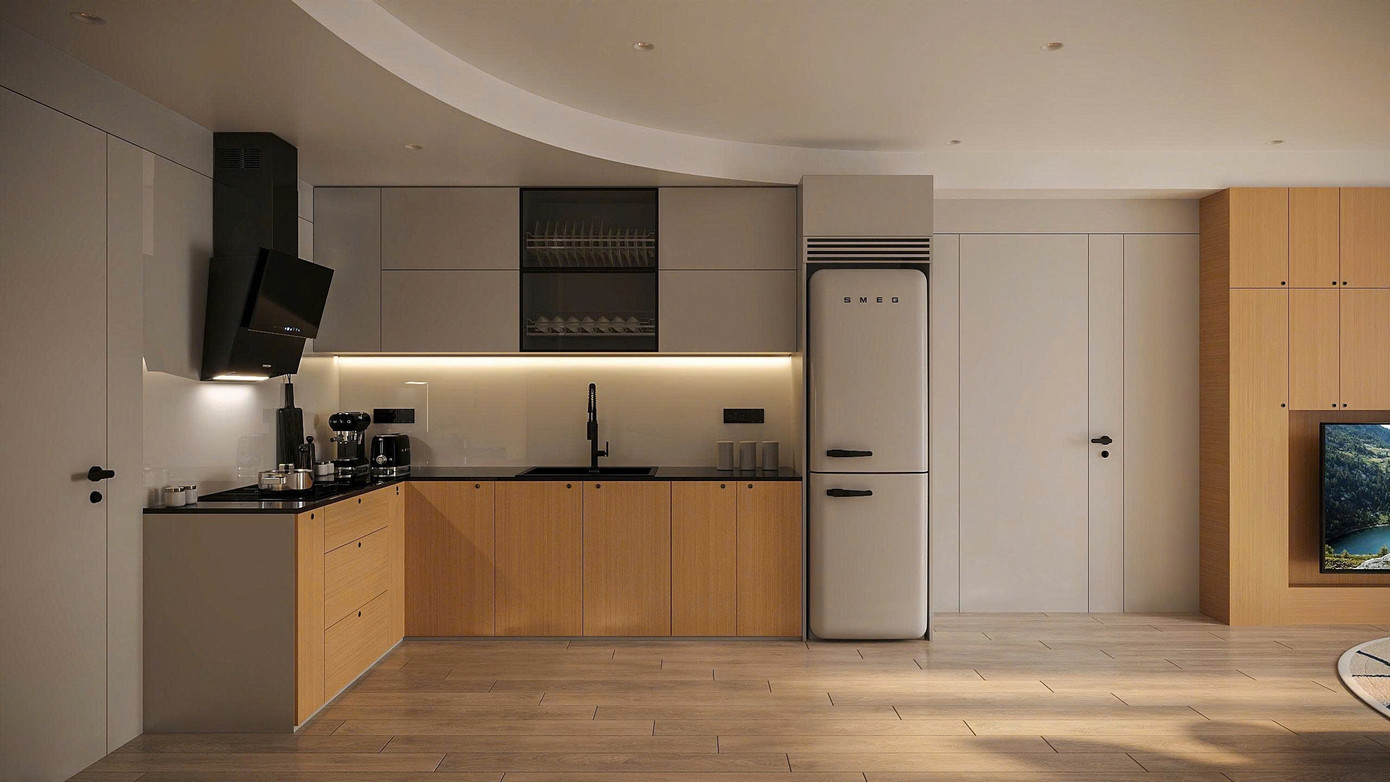 Khu vực khách bếp thiết kế sử dụng tông màu trung tính làm chủ đạo như kem, be, trắng sữa và vàng nhạt. Màu sắc này đóng vai trò như một bức nền hoàn hảo để tôn vinh các tác phẩm nghệ thuật và đồ nội thất có hình khối lạ mắt.