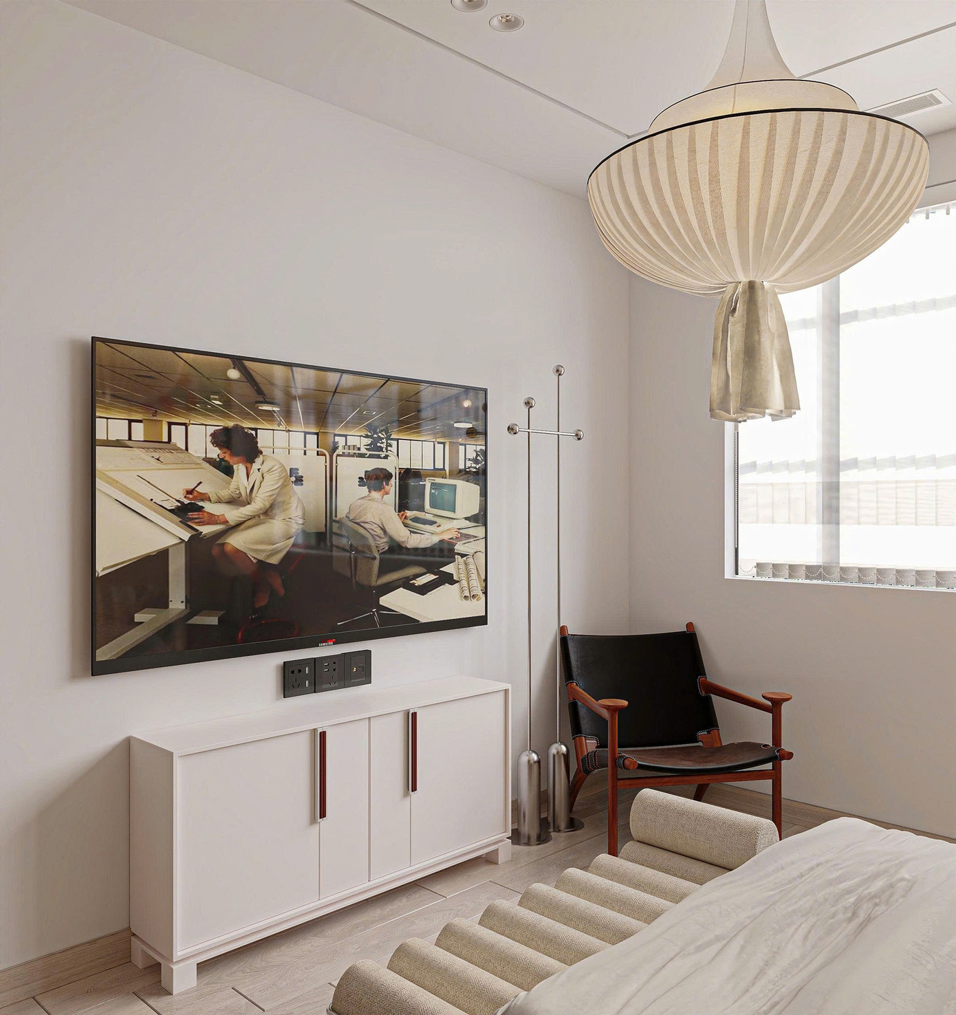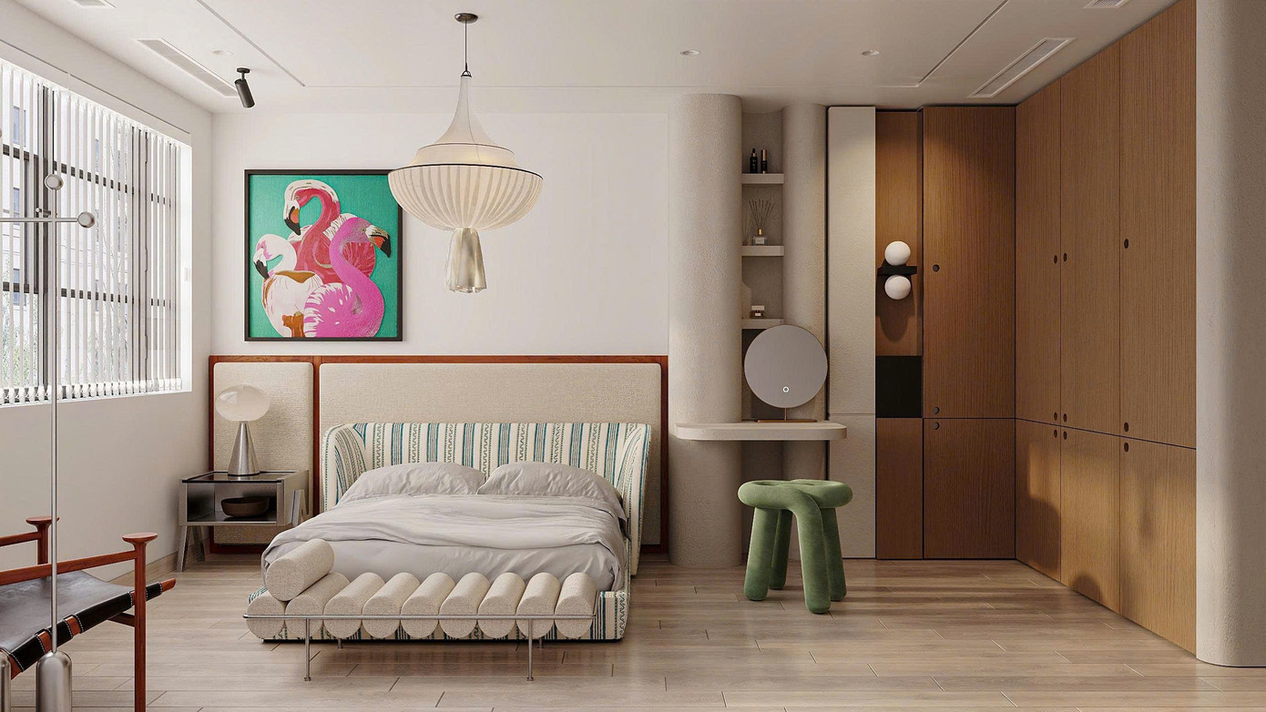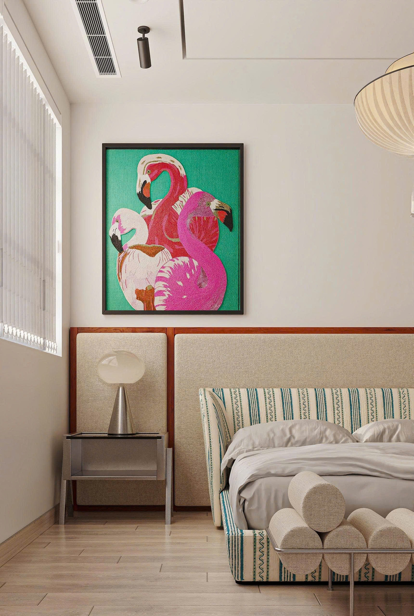 Bức tranh chim hồng hạc phía đầu giường là điểm chạm cảm xúc, có phần ngẫu hứng, giàu màu sắc, mang hơi hướng pop-art (đặc điểm với khối màu sống động, tương phản cao), nhưng lại được đặt trong một bố cục rất tiết chế. Chính sự tương phản này tạo nên tinh thần nghệ thuật không bị đóng khung trong một phong cách cứng nhắc.