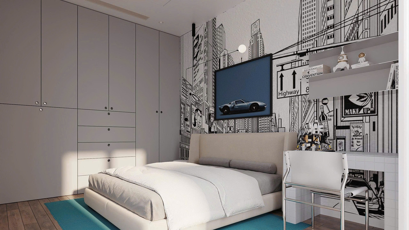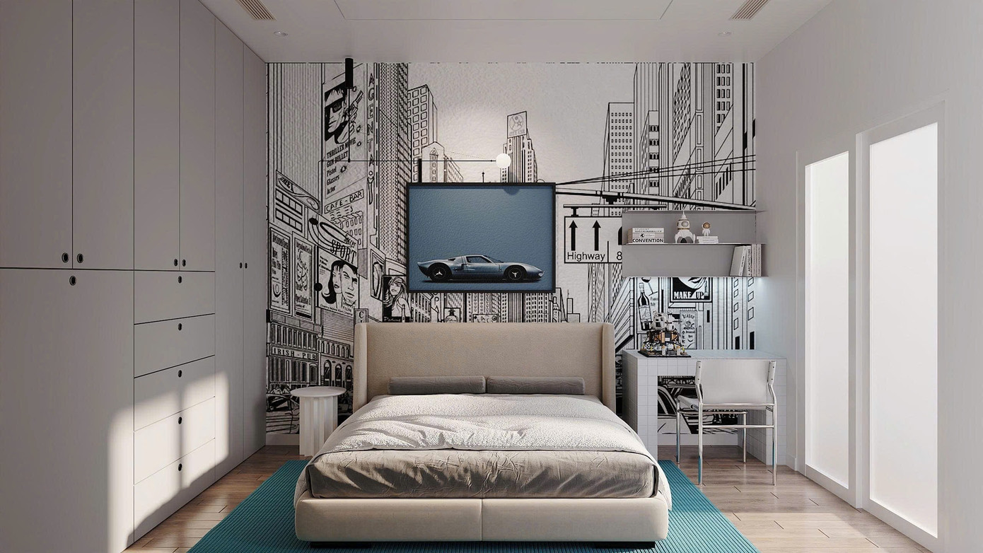 Phòng ngủ phụ là một không gian lấy ý tưởng từ sở thích đam mê tốc độ và công nghệ của gia chủ, kết hợp với phong cách graffiti đường phố. Mảng tường đầu giường sử dụng tranh graffiti đen - trắng lấy cảm hứng từ những con phố đô thị sôi động, tạo chiều sâu thị giác và cảm giác chuyển động liên tục, như nhịp sống của thành phố.