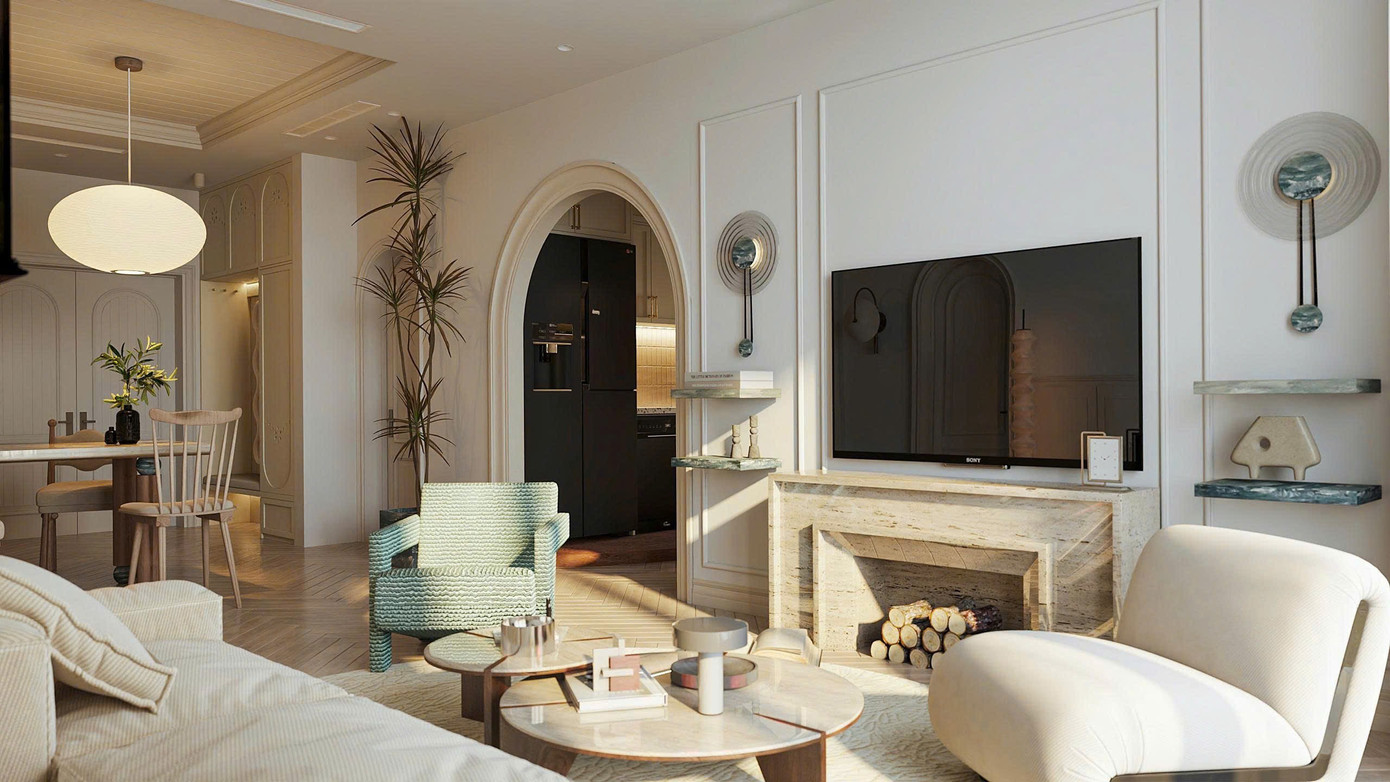 Phòng khách thanh lịch với bảng màu chủ đạo là trắng - kem - vàng nhạt, gợi cảm giác của cát mịn dưới nắng sớm. Tông màu này phủ đều từ tường, trần cho tới nội thất, tạo sự liền mạch và nhẹ nhàng.