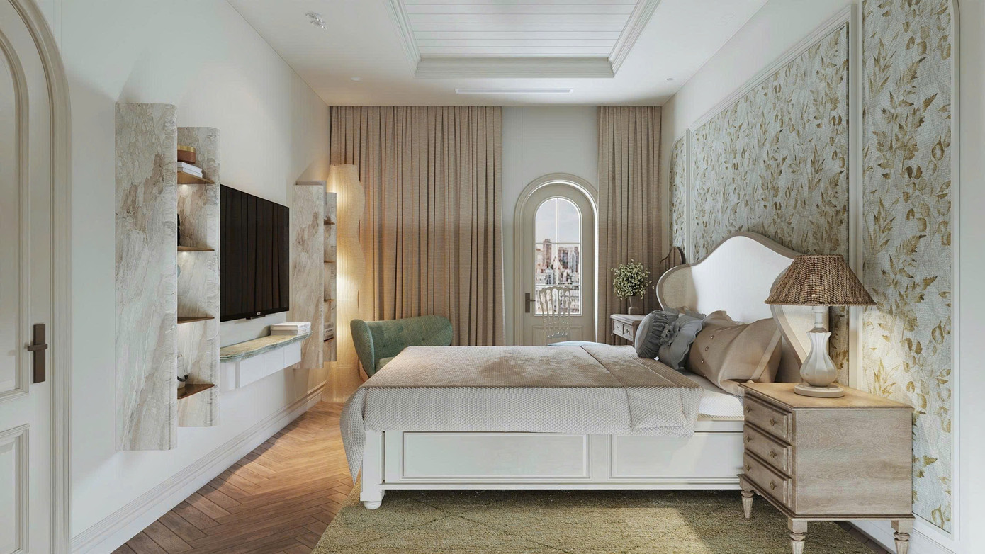 Phòng ngủ master thiết kế có nét cổ điển nhưng tiết chế nhằm giữ lại sự đơn giản với mong muốn không gian thực sự yên bình và tái tạo năng lượng. Hơi hướng chất Modern Farmhouse - nơi hòa quyện giữa nét đẹp đồng quê và sự tinh tế hiện đại.