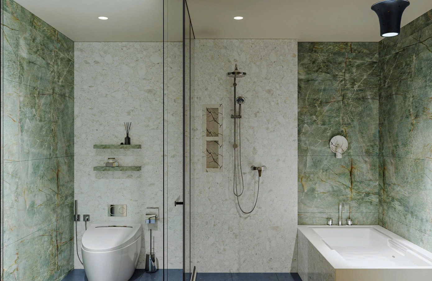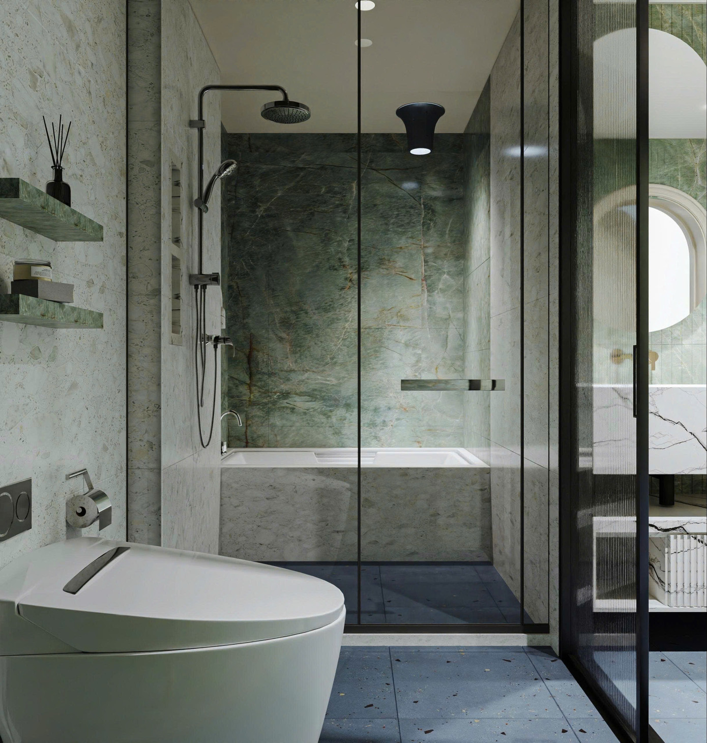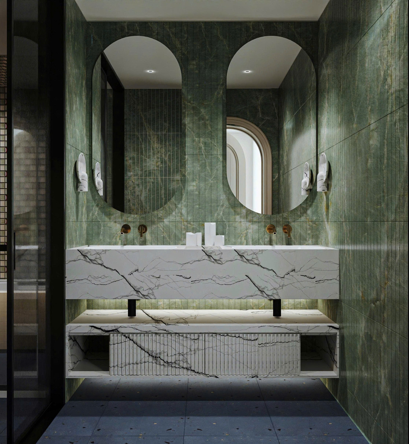 WC phòng ngủ master như biển đêm với sắc xanh sâu lắng, không gian sử dụng sự kết hợp tinh tế giữa đá xanh vân tự nhiên và đá sáng trung tính. Hai mảng tường đá xanh với vân loang tựa đá cẩm thạch mang lại cảm giác mát mẻ, sâu lắng, gợi liên tưởng đến nước, rừng và thiên nhiên. Phần tường đá sáng ở trung tâm giúp cân bằng thị giác, làm không gian sáng hơn và không bị nặng nề.