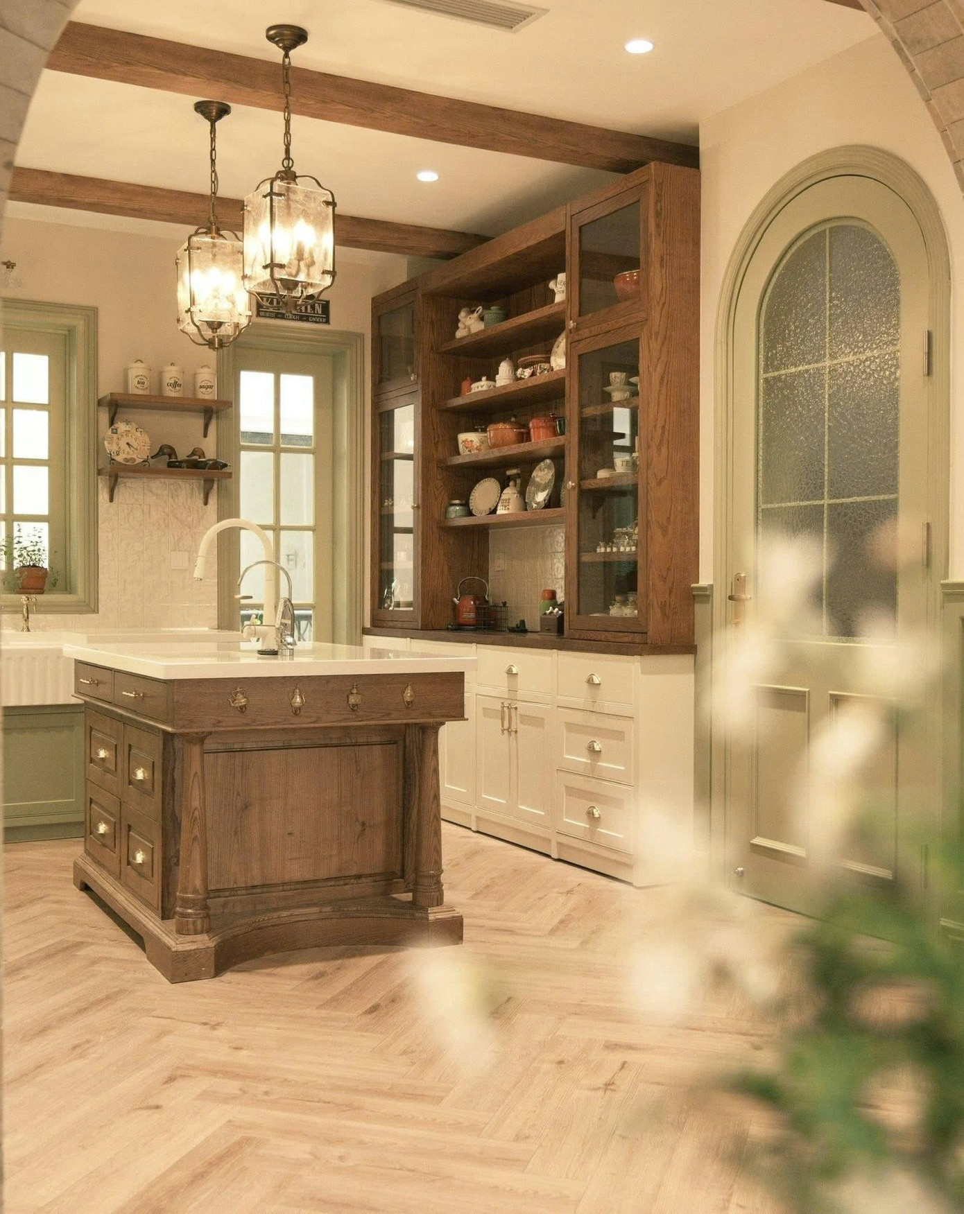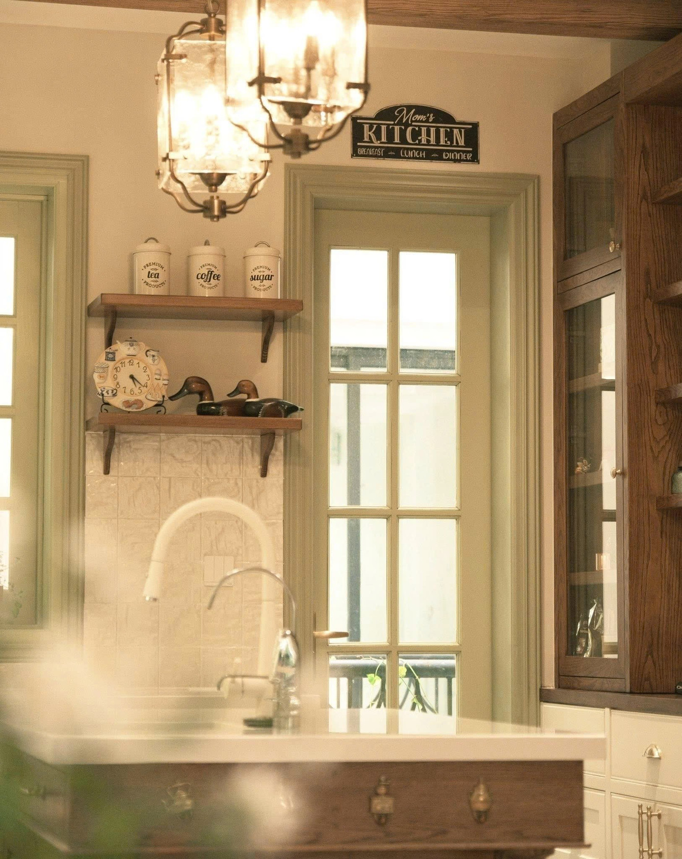Chủ nhân căn bếp từng đi qua nhiều phong cách khác nhau, từ tối giản, hiện đại đến modern farmhouse, trước khi dừng lại ở cottagecore – phong cách đề cao sự mộc mạc, gần gũi với thiên nhiên và gợi nhớ nhịp sống chậm. Tông xanh bơ dịu nhẹ phủ lên không gian bếp như một lớp nền cảm xúc, kết hợp cùng hệ tủ gỗ màu hạt dẻ tạo nên tổng thể ấm cúng, vintage nhưng không hoài cổ nặng nề. Đó là sự hoài niệm được tiết chế, vừa đủ để mang lại cảm giác thân thuộc.