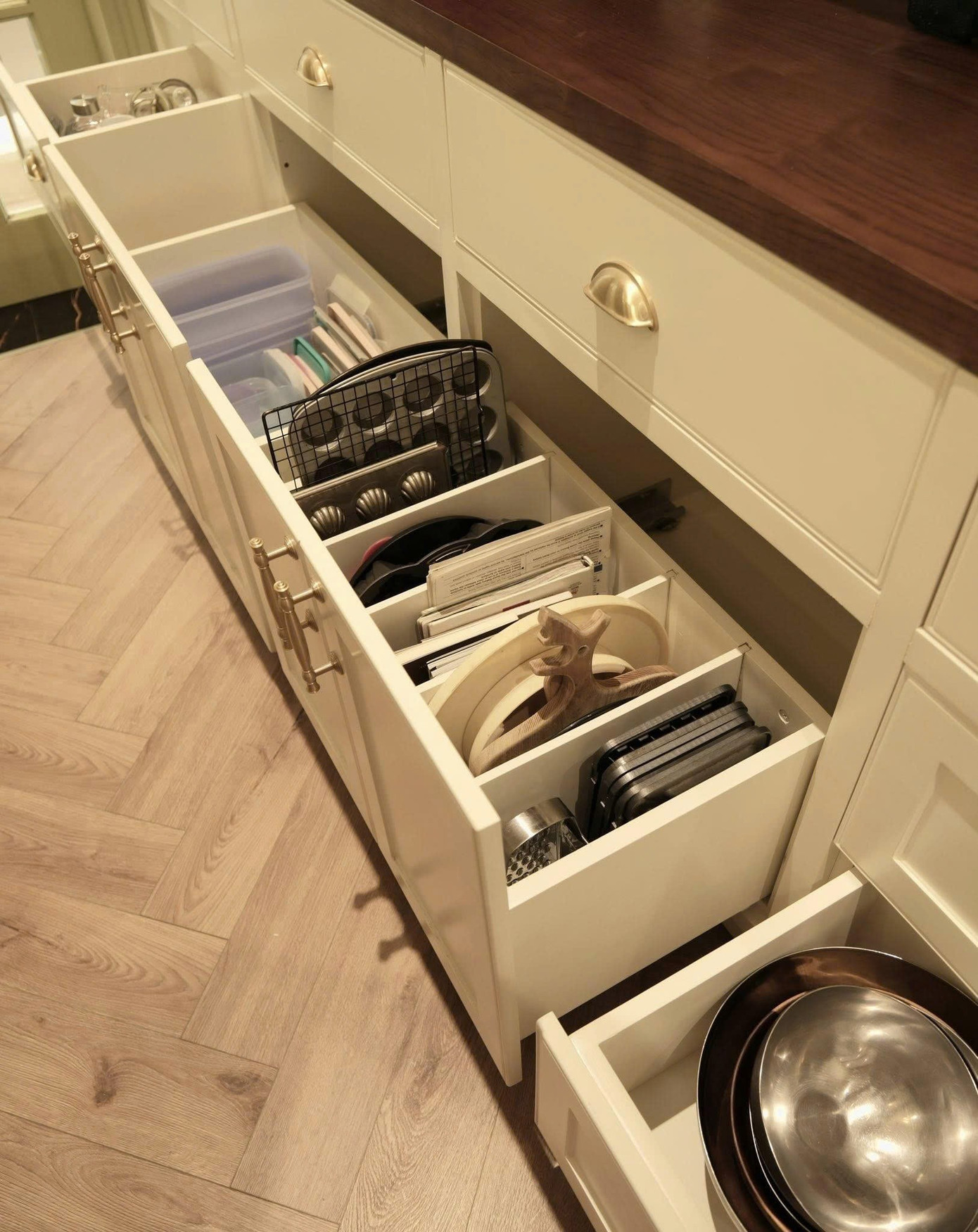 Không gian lưu trữ được tổ chức khoa học với các ngăn kéo chia công năng rõ ràng: từ dao thìa dĩa, đồ làm bánh đến thớt, nồi chảo. Thay vì sử dụng phụ kiện inox đại trà, gia chủ lựa chọn hệ kệ gỗ đóng riêng, kết hợp ray âm, mang lại cảm giác chắc chắn và hài hòa với tổng thể cottagecore. Khu pantry cũng được biến tấu linh hoạt, với khoang kính phía trên để trưng bày bộ sưu tập gốm sứ vintage, phía dưới là các ngăn kéo mở toàn phần dành cho đồ khô, trà và cà phê.