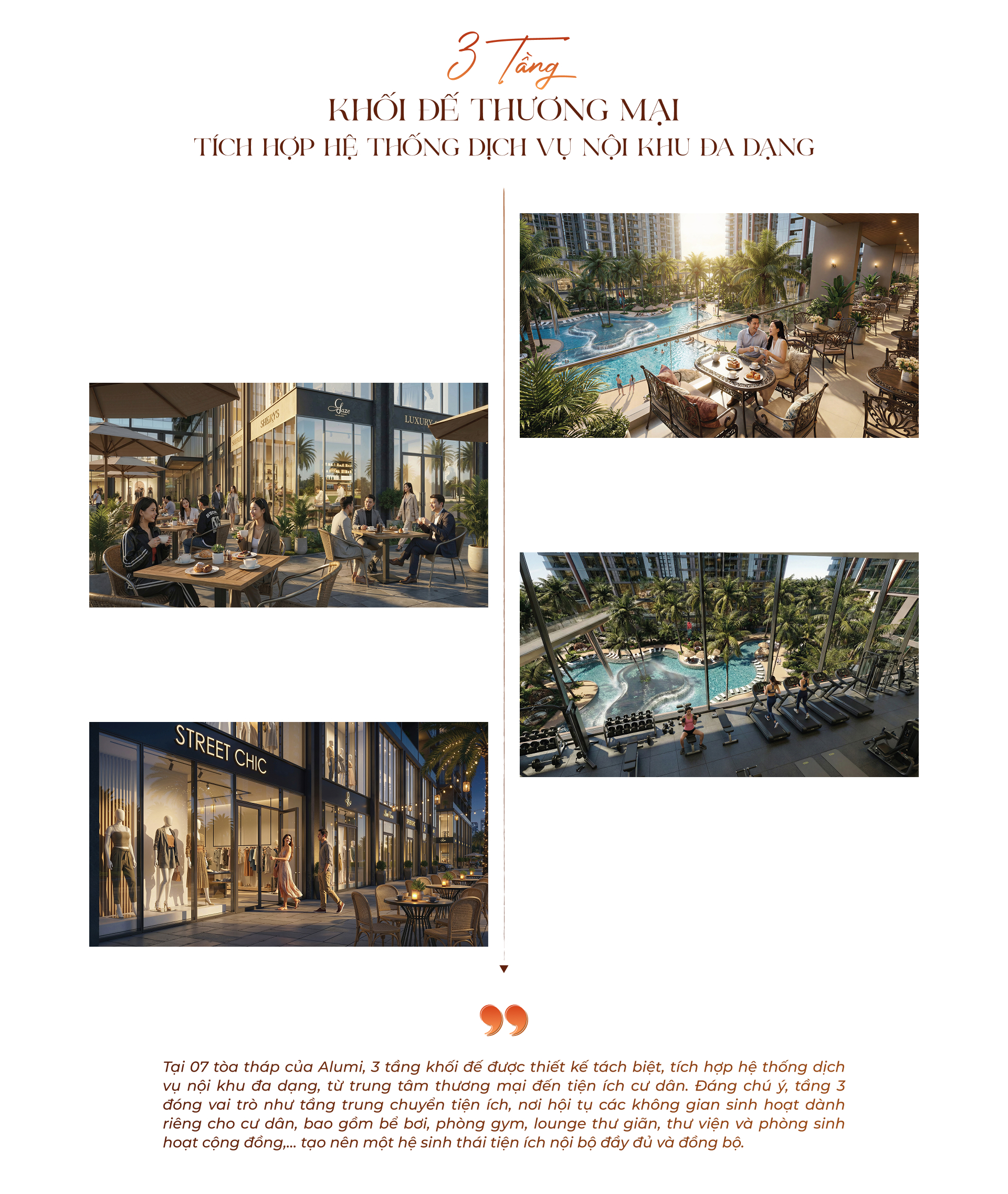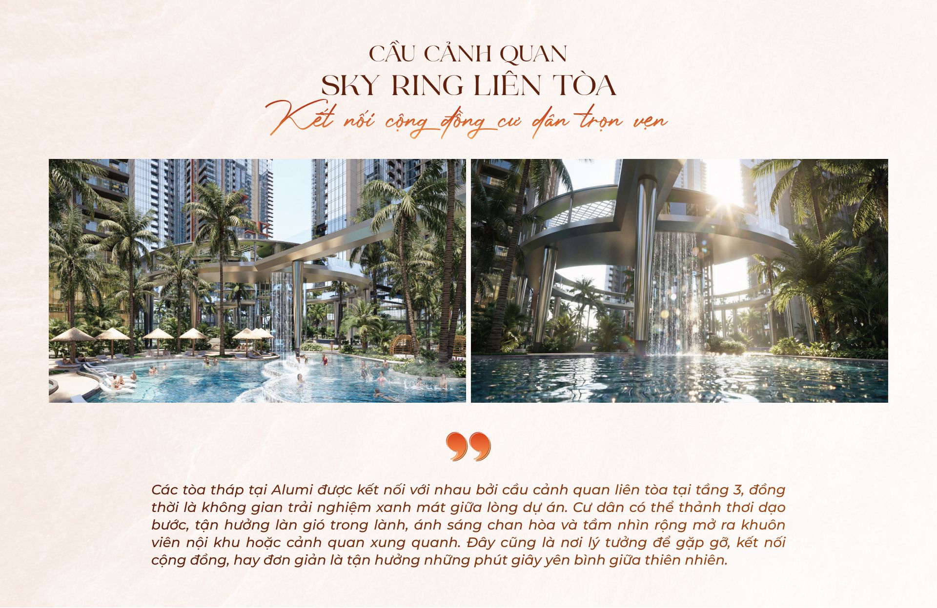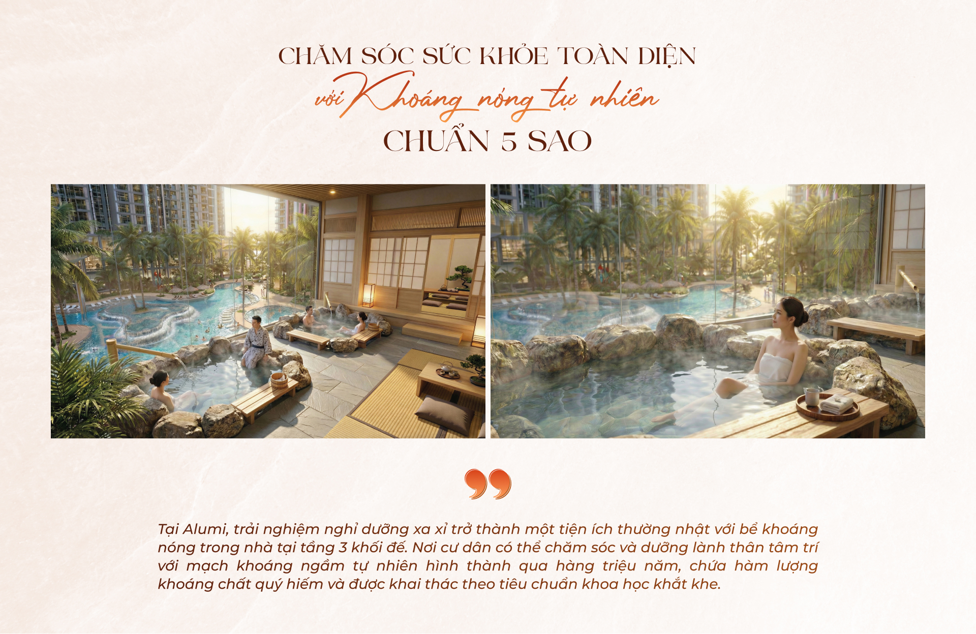 Sở hữu đặc quyền khoáng nóng tự nhiên, hệ tiện ích khối đế đa dạng cùng lõi cảnh quan như một "tiểu resort" ngay trong khuôn viên, Alumi mang đến hành trình nuôi dưỡng thân - tâm - trí trọn vẹn 365 ngày. Đó không chỉ là không gian sống, mà là nơi kiến tạo phong cách "wellness living" đích thực giữa lòng đô thị.