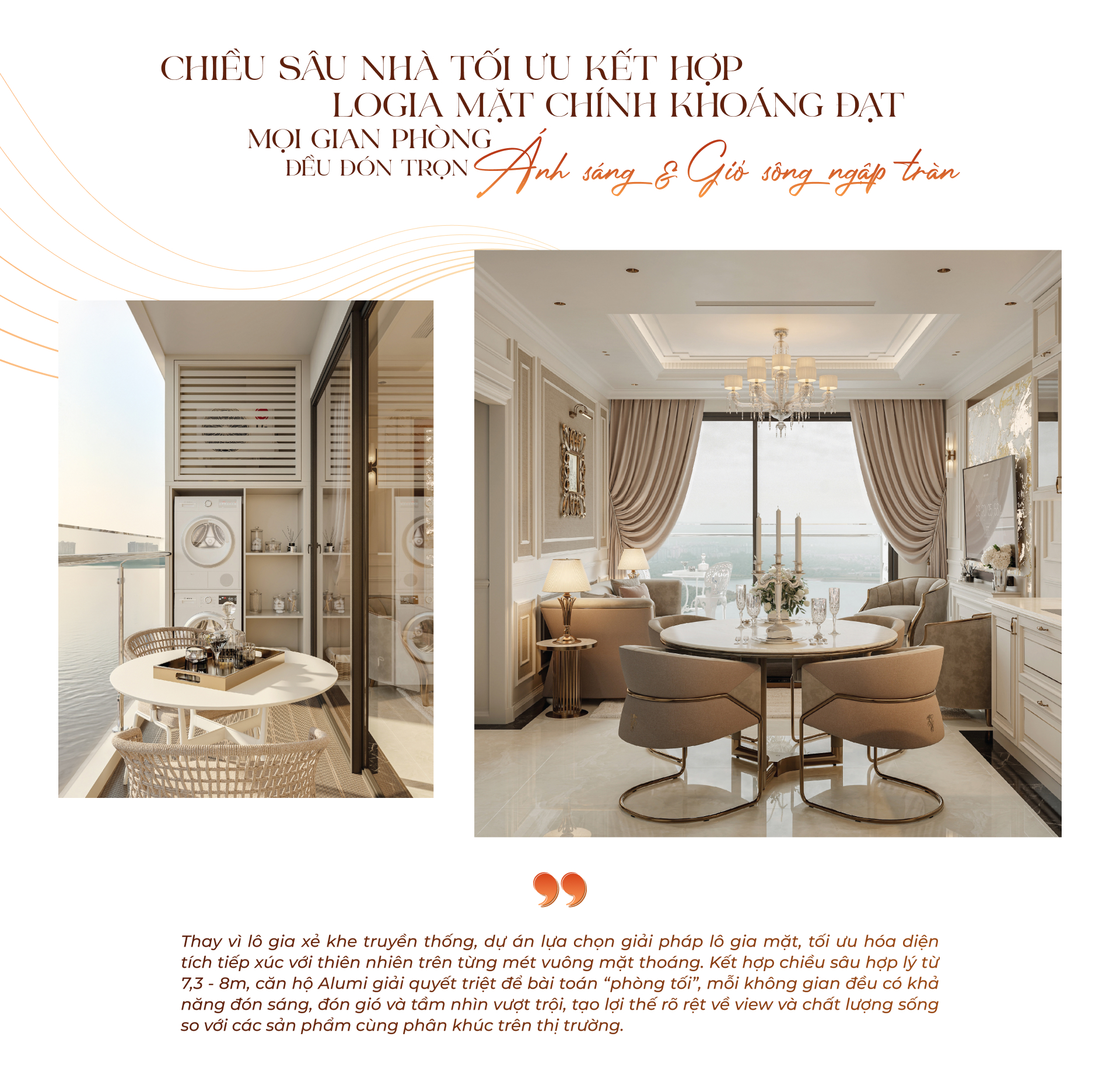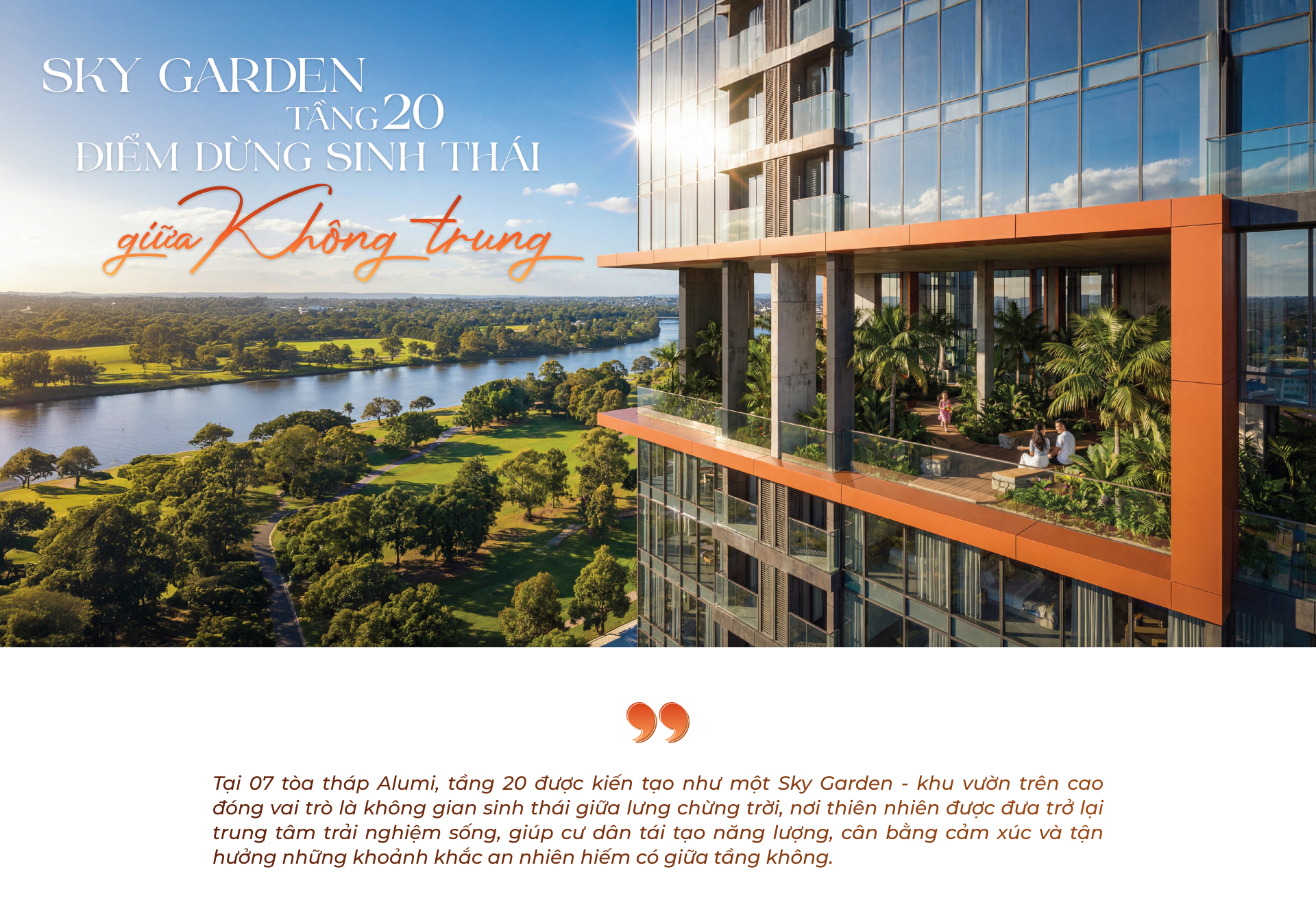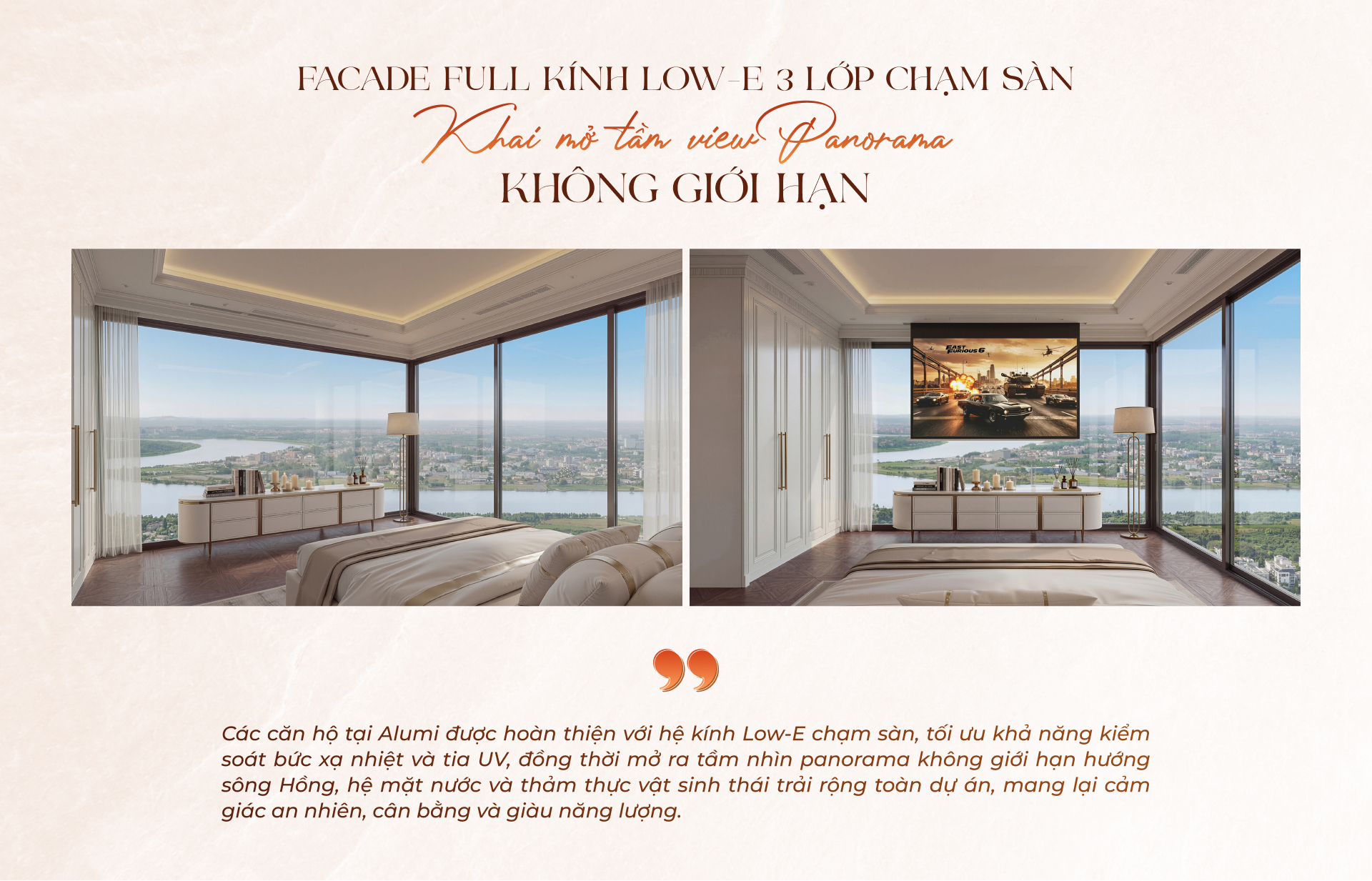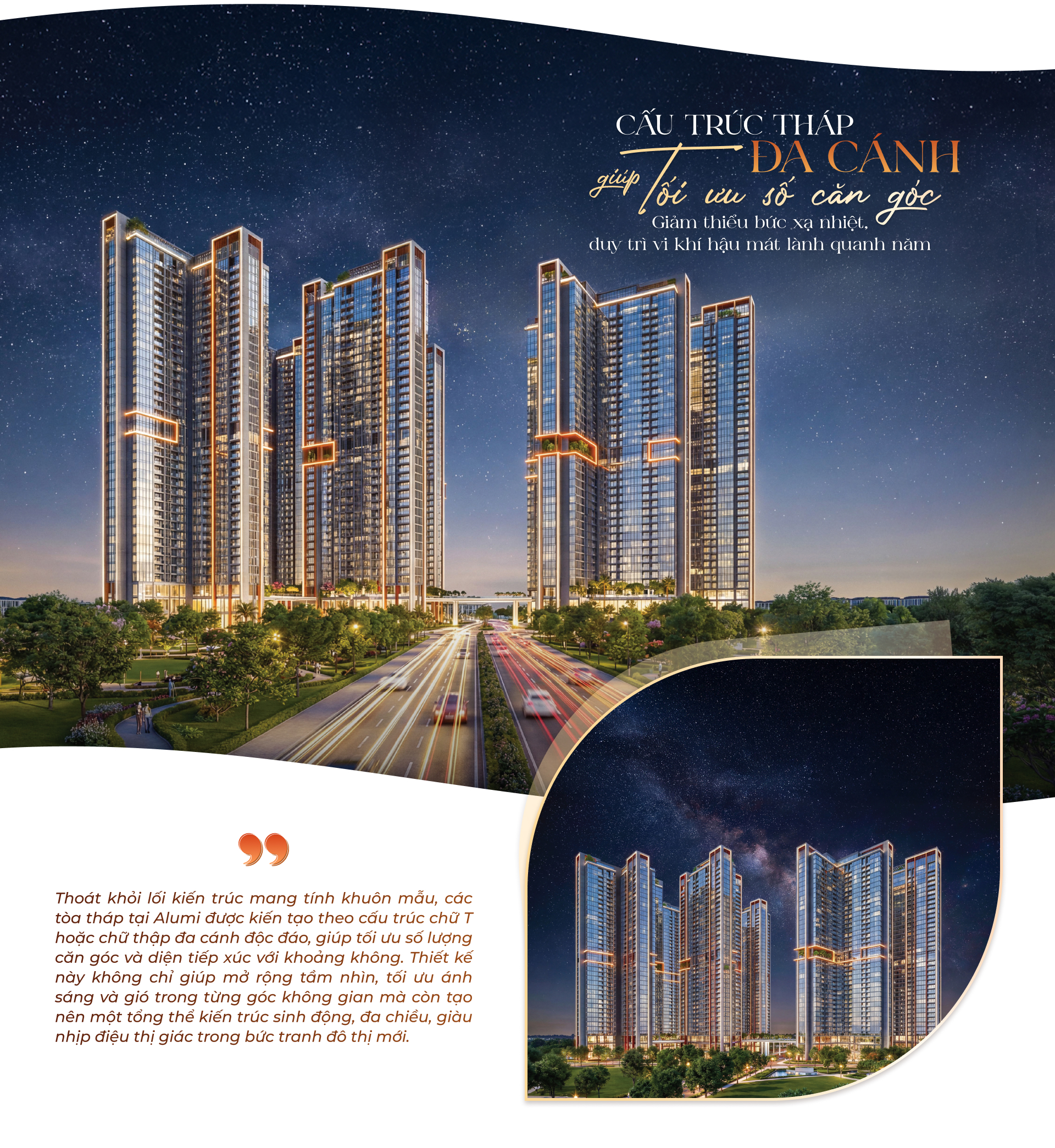 Tổ hợp 7 toà tháp cao tầng Alumi như những nét vẽ hiện đại vươn mình trên bầu trời khoáng đạt của Alluvia City. Dưới chân công trình là mạch khoáng quý hiếm hình thành qua hàng triệu năm; trên mặt đất là đại cảnh phù sa trù phú cùng sông Hồng kỳ vĩ; còn giữa tầng không là những cơn gió mát lành và vi khí hậu đặc hữu ven sông. Sự cộng hưởng tự nhiên hiếm có ấy trở thành nền tảng cho tư duy quy hoạch "hướng tự nhiên", để ánh sáng, gió và không khí trong lành được dẫn dắt chủ động vào từng không gian sống.