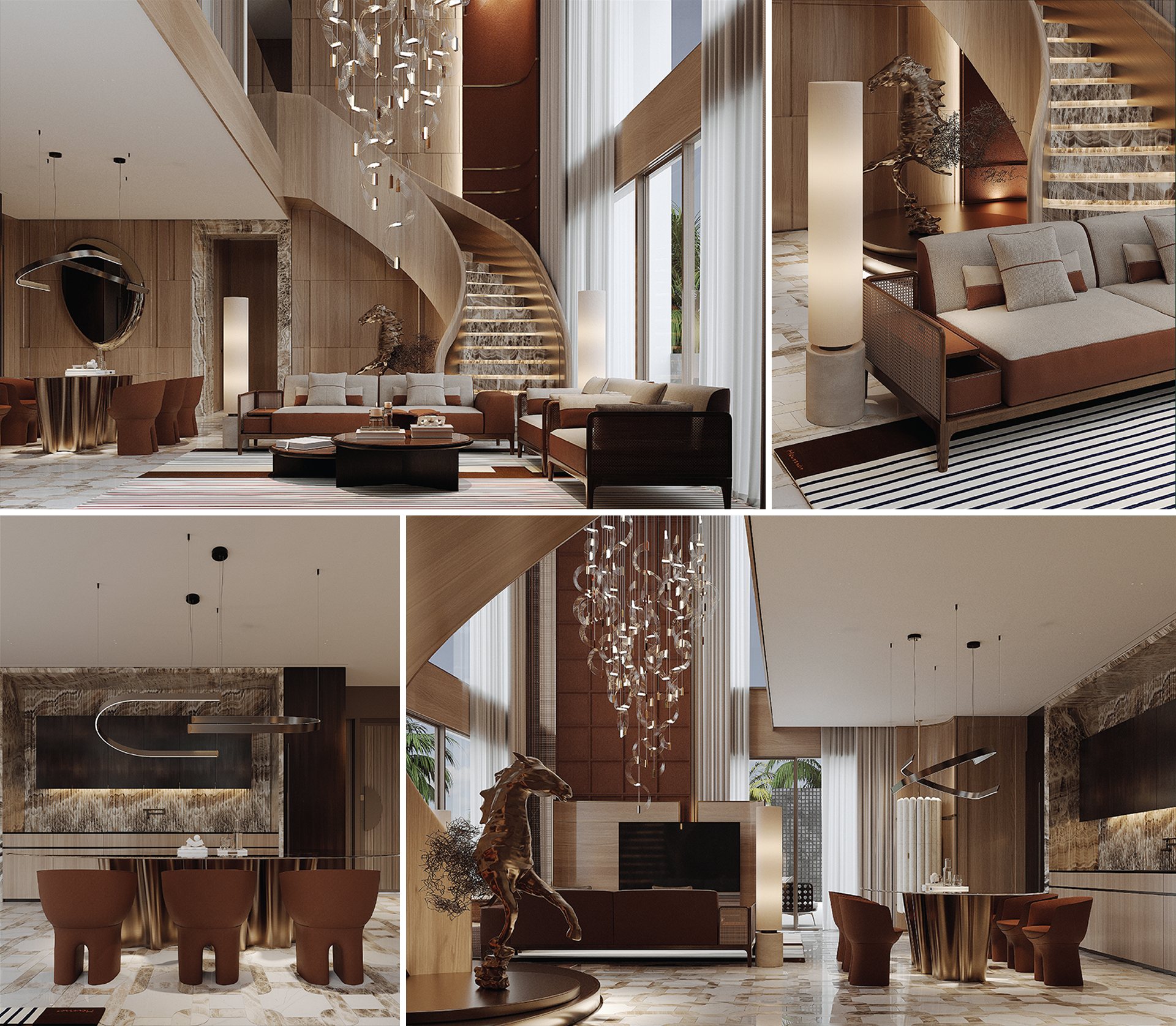 Các gam nâu đất, terracotta, be champagne và vàng ánh kim tạo nên nền thị giác ấm áp, kết hợp gỗ cao cấp, da thuộc tinh tuyển, kim loại hoàn thiện tinh xảo và đá tự nhiên. Hình khối nội thất vuông vức, chắc chắn nhưng được làm mềm bằng những đường cong tinh tế và ánh sáng gián tiếp, mang lại cảm giác quyền lực mà vẫn thanh lịch. Một không gian sống đậm chất modern classic – chuẩn mực, bền vững với thời gian và phản ánh rõ nét gu thẩm mỹ sắc sảo, quyền lực của những gia chủ am hiểu giá trị xa xỉ thực thụ.