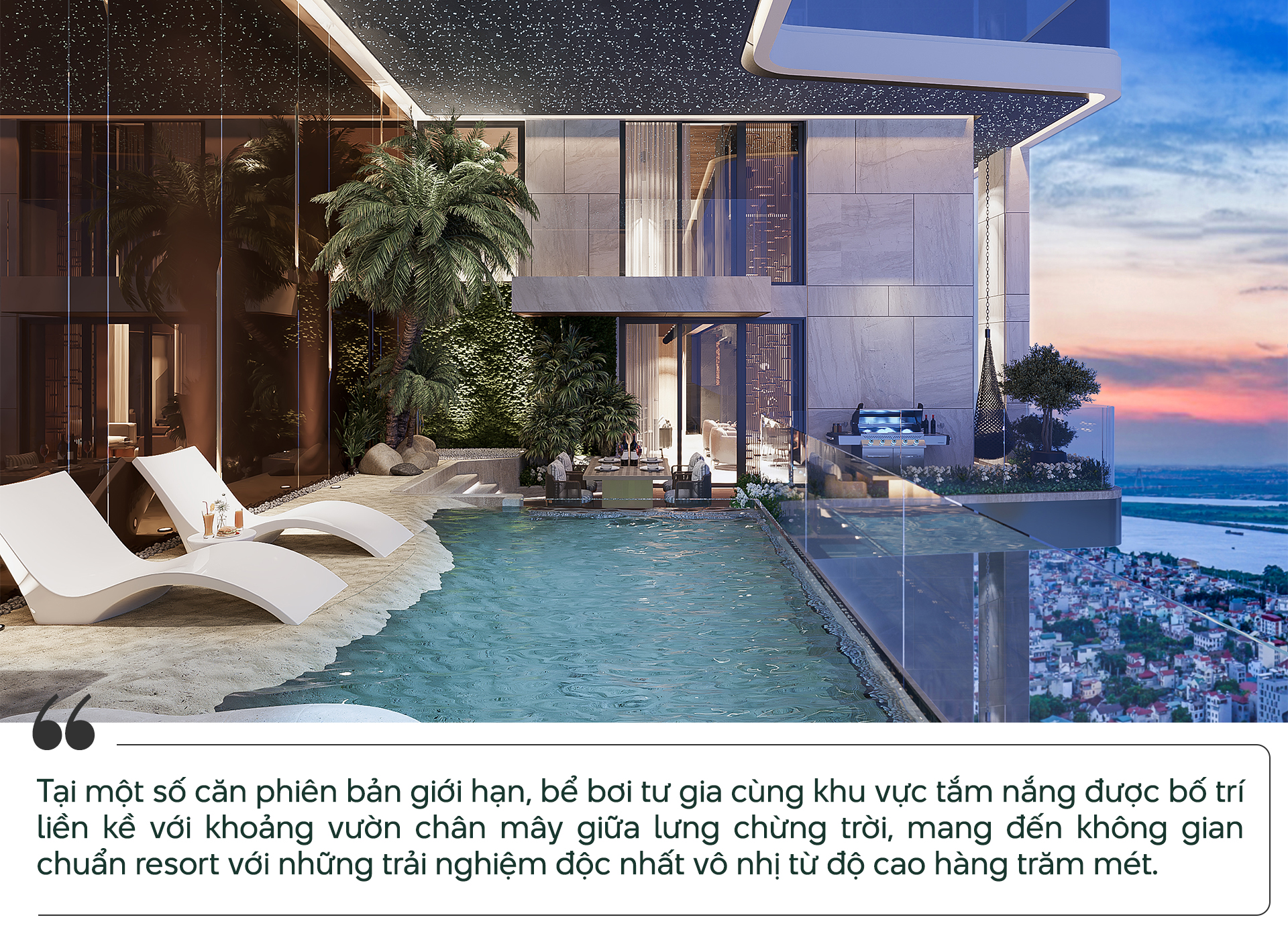 Đặc biệt, tại các căn Sky Mansion phiên bản limited, bên cạnh cấu trúc duplex thông tầng khoáng đạt và tầm view mở rộng không giới hạn, chủ nhân còn sở hữu không gian sân vườn riêng kết hợp bể bơi trên cao – một đặc quyền hiếm có tạo nên chuẩn sống resort độc bản, nơi mỗi khoảnh khắc sinh hoạt đều trở thành trải nghiệm thư thái và đầy cảm hứng.