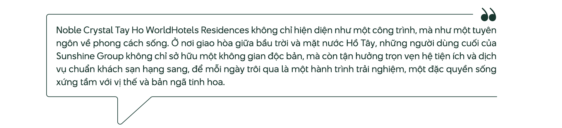 Kết hợp “dàn giao hưởng” 50 tiện ích tiêu chuẩn quốc tế được bố trí xuyên suốt từ mặt đất tới tầng thượng, Noble Crystal Tay Ho WorldHotels Residences mang đến âm hưởng của một “thành phố nghỉ dưỡng” (Resort City) theo chiều thẳng đứng hiếm có tại Việt Nam: từ tổ hợp giải trí mặt đất sôi động; tổ hợp thương mại dịch vụ tại 5 tầng khối đế; đến tổ hợp clubhouse tại tầng 20 và tổ hợp nghỉ dưỡng chân mây tầng 39 - 40. Trong đó, YAMA, tổ hợp nhà hàng, hồ bơi và sky bar chuẩn 6 sao tại tầng 39–40 do Sunset Hospitality Group vận hành, không chỉ là một tiện ích biểu tượng, mà còn cho thấy cam kết của Sunshine Group trong việc kết nối chuẩn sống toàn cầu, nâng tầm giá trị sống tại Tây Hồ Tây, và kiến tạo những điểm đến vượt thời gian cho Hà Nội.