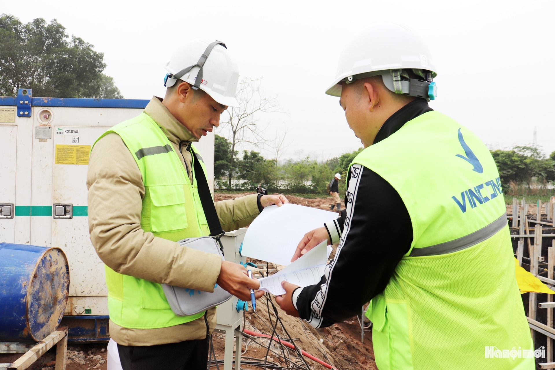 Kỹ sư Nguyễn Đình Đức (bên trái) phụ trách kỹ thuật thi công dự án Khu đô thị thể thao Olympic đang trao đổi công việc với đồng nghiệp. Ảnh: Tuấn Điệp