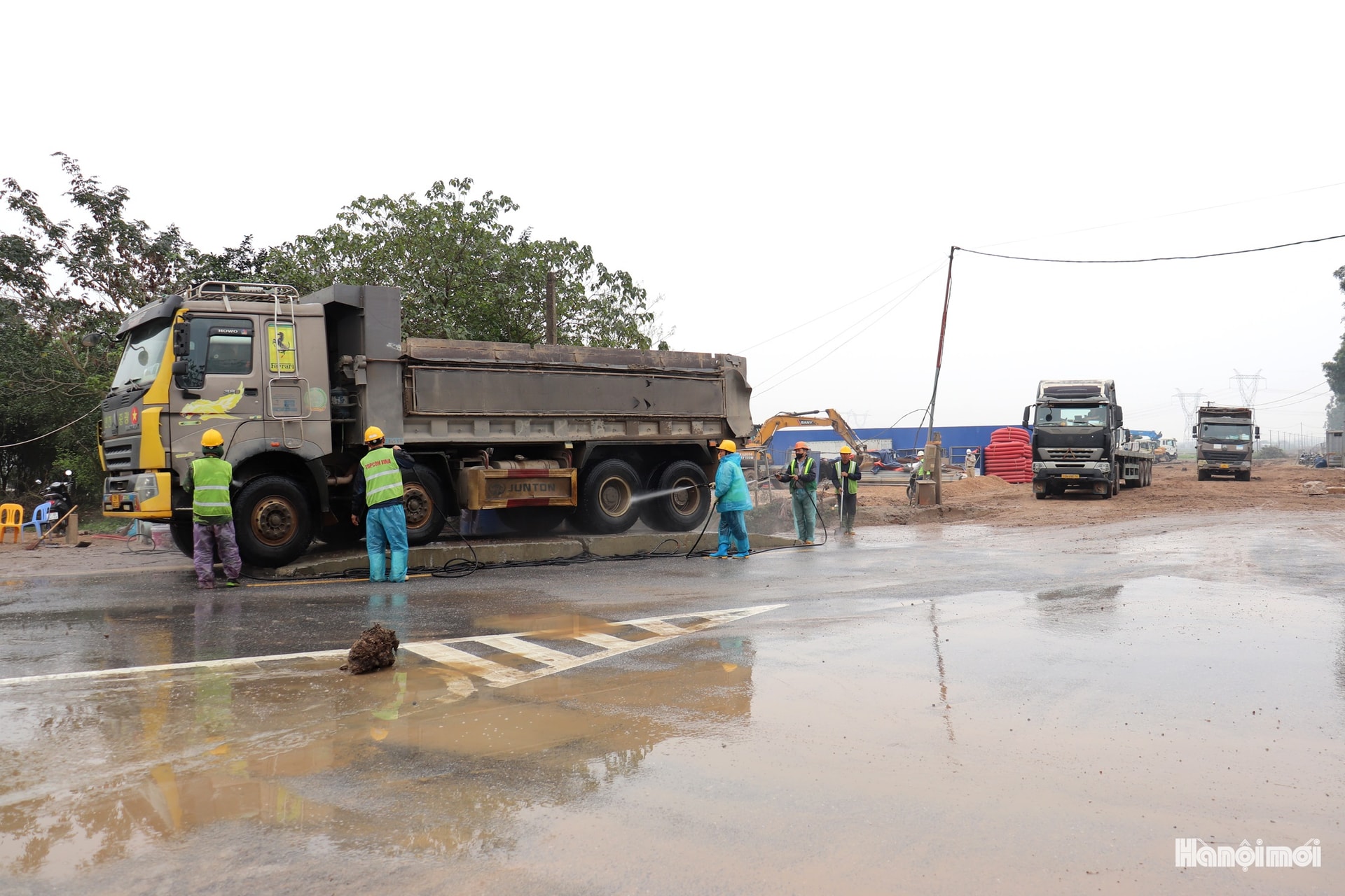 Hiện tại chưa thi công xong cầu rửa xe tự động, nên các công nhân dùng máy bơm xịt rửa xe sạch sẽ khi ra khỏi công trường. Ảnh: Tuấn Điệp