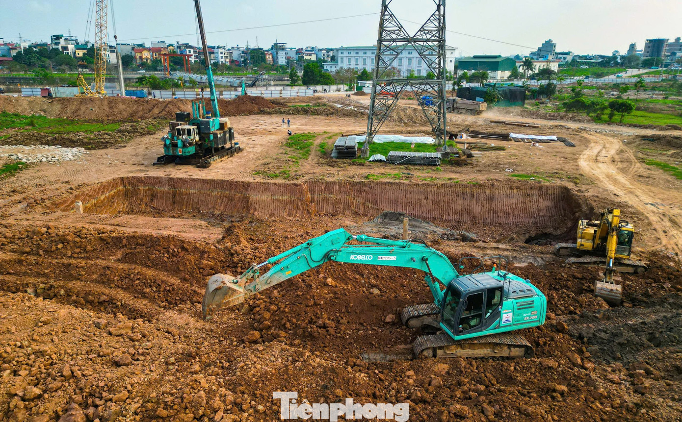 Trên công trường, hàng loạt máy móc và công nhân đang khẩn trương làm việc, xe tải nối đuôi nhau vận chuyển đất đào ra ngoài để đảm bảo tiến độ.