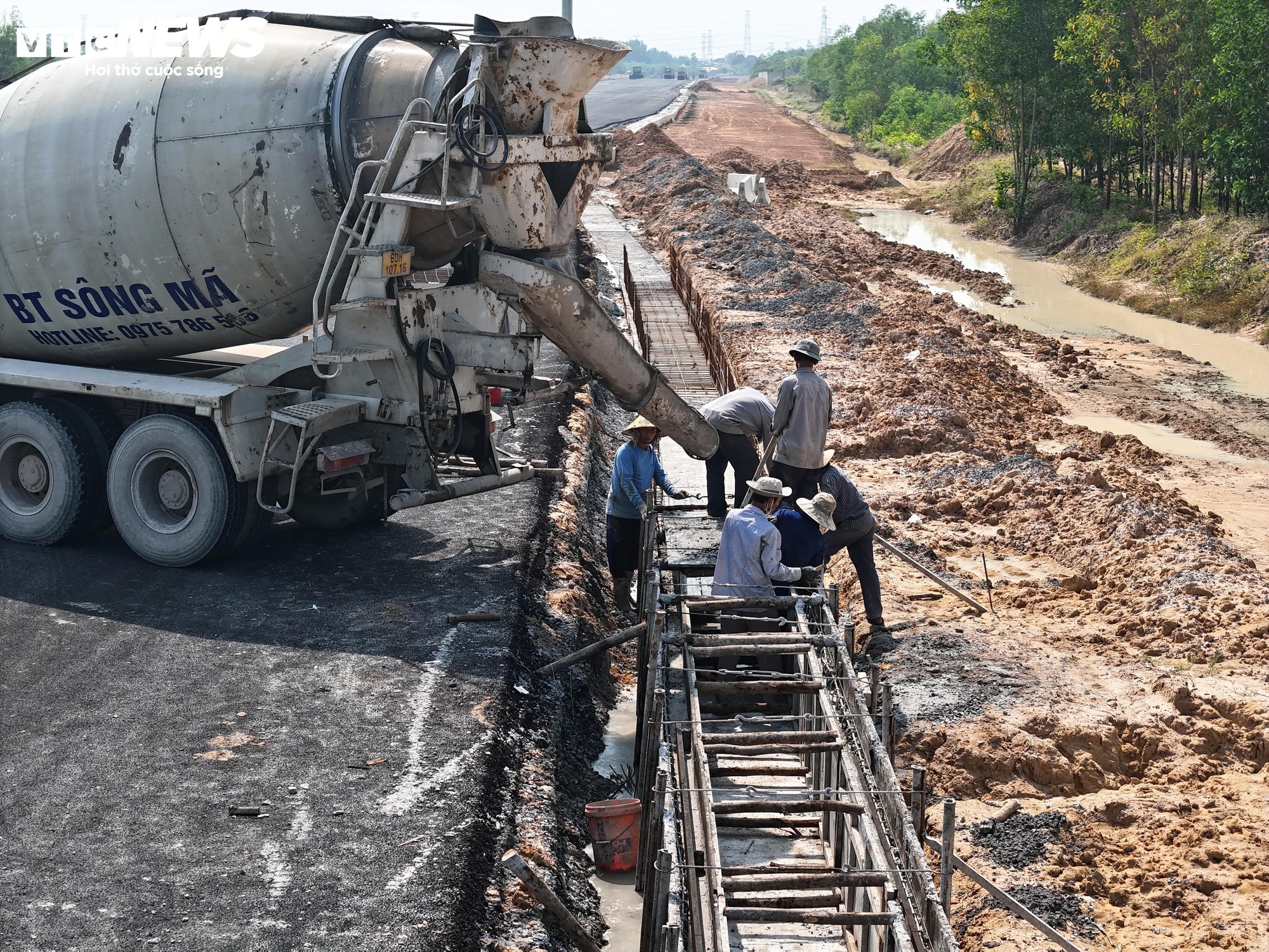 Trên công trường, hàng trăm công nhân cùng máy móc được huy động, tổ chức thi công đồng loạt theo nhiều mũi, tập trung vào các hạng mục thảm nhựa mặt đường, cống rãnh và đắp đất nền.