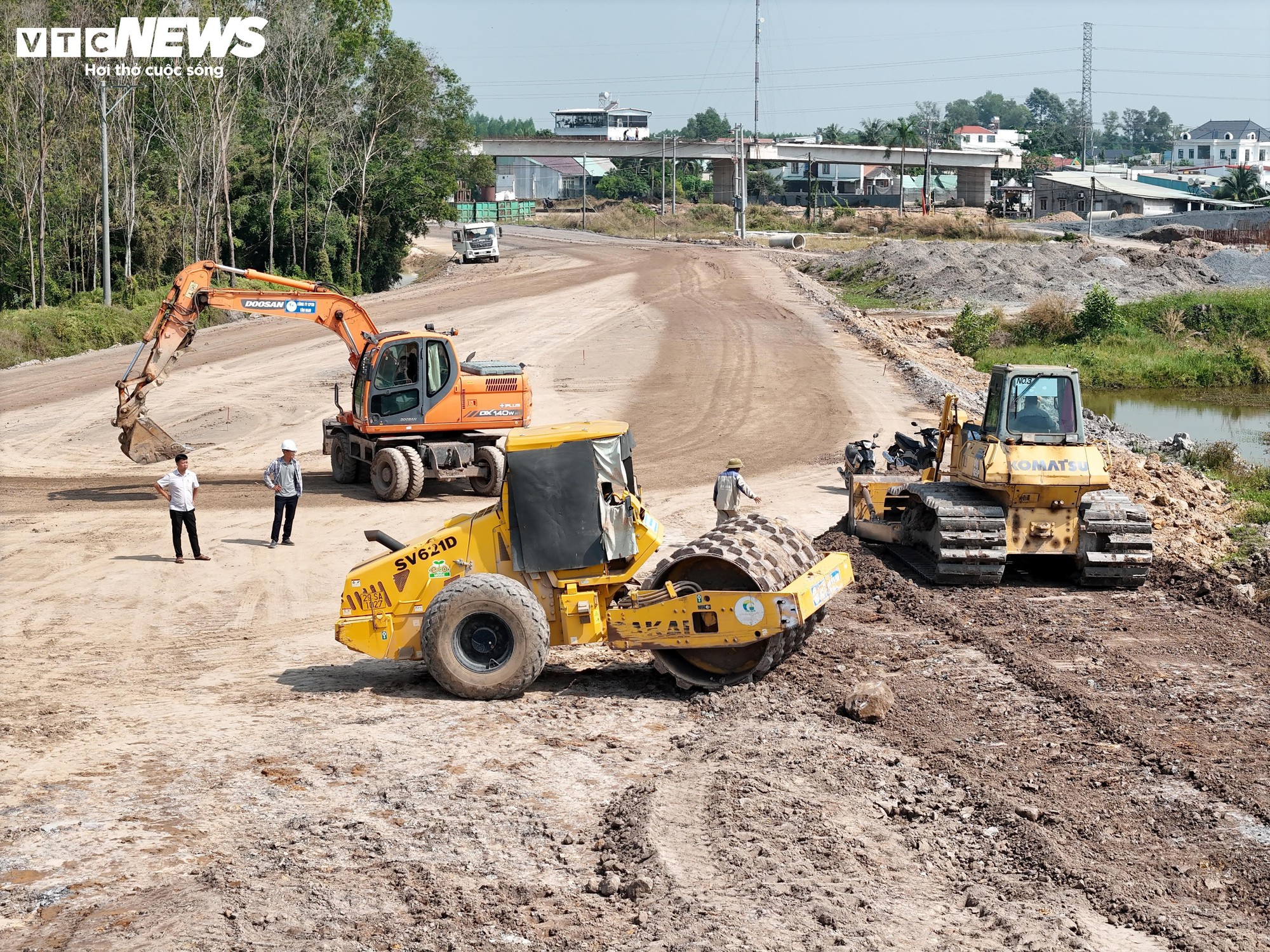 Theo ghi nhận của PV Báo Điện tử VTC News, tại nút giao với cao tốc Bến Lức - Long Thành (xã Phước An), các đơn vị thi công đang tập trung triển khai hạng mục đắp đất, hoàn thiện các lối ra, vào kết nối với tuyến cao tốc.