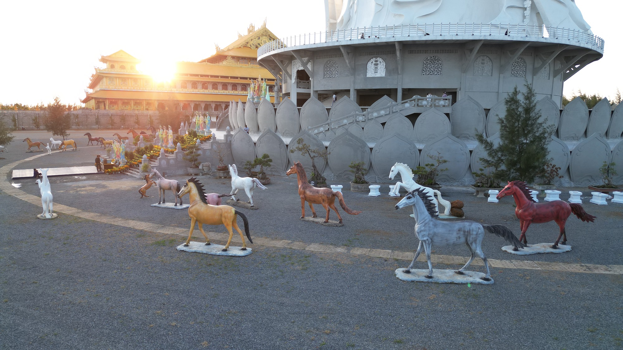 Dưới chân tượng Quan Âm là cụm tượng đàn ngựa, tạo điểm nhấn cho không gian quảng trường chùa Minh Đức. Trong văn hóa Phật giáo, hình tượng ngựa gắn với tinh thần tinh tấn, bền bỉ trên hành trình tu tập, thường được nhắc đến qua tích ngựa Kiền Trắc trong Phật sử.