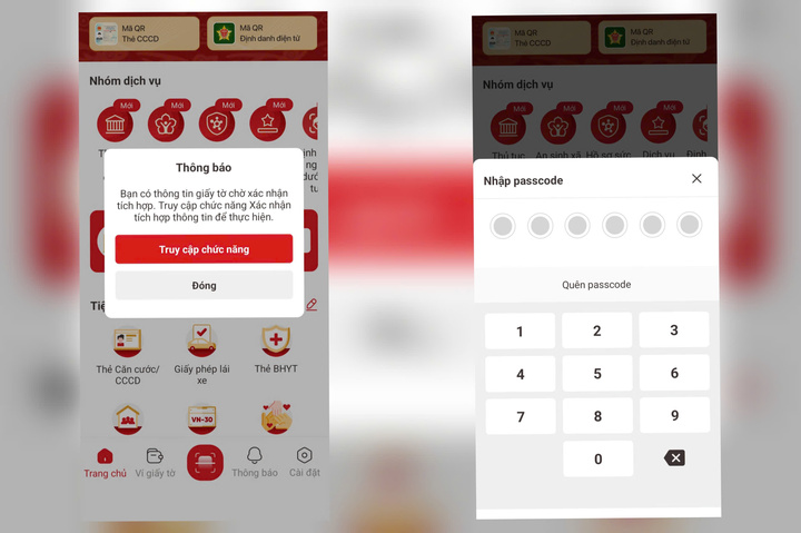 Bước 1: Khi nhận được thông báo từ ứng dụng VneID với nội dung “Bạn có thông tin giấy tờ chờ xác định tích hợp” , người dùng nhấp vào mục Truy cập chức năng .